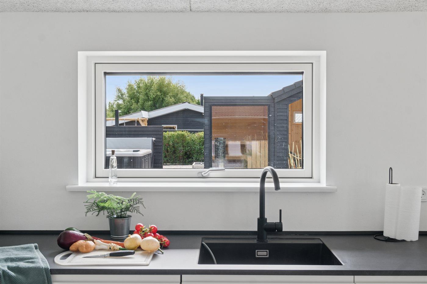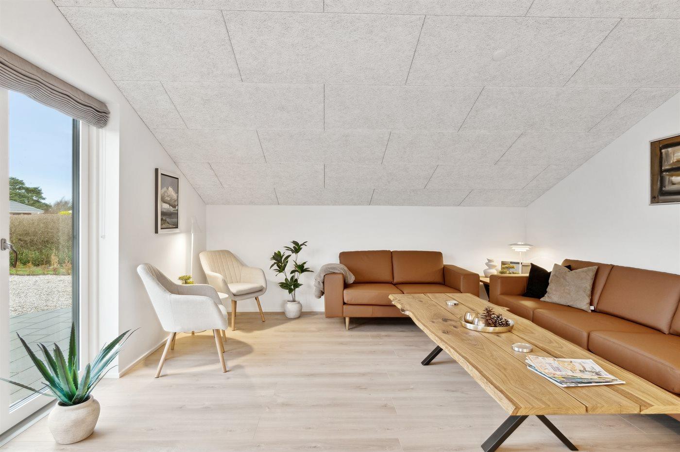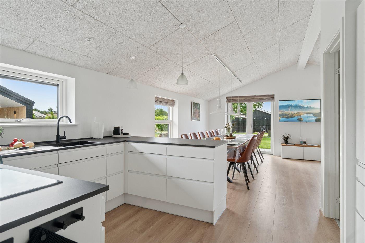 Huset er moderne og sommerligt indrettet og er lyst og rummeligt takket være det store lysindfald og loft-til-kip i de fleste rum. Det store moderne køkkenalrum i åben forbindelse med stuen udgør det naturlige samlingssted for hygge og samvær.
