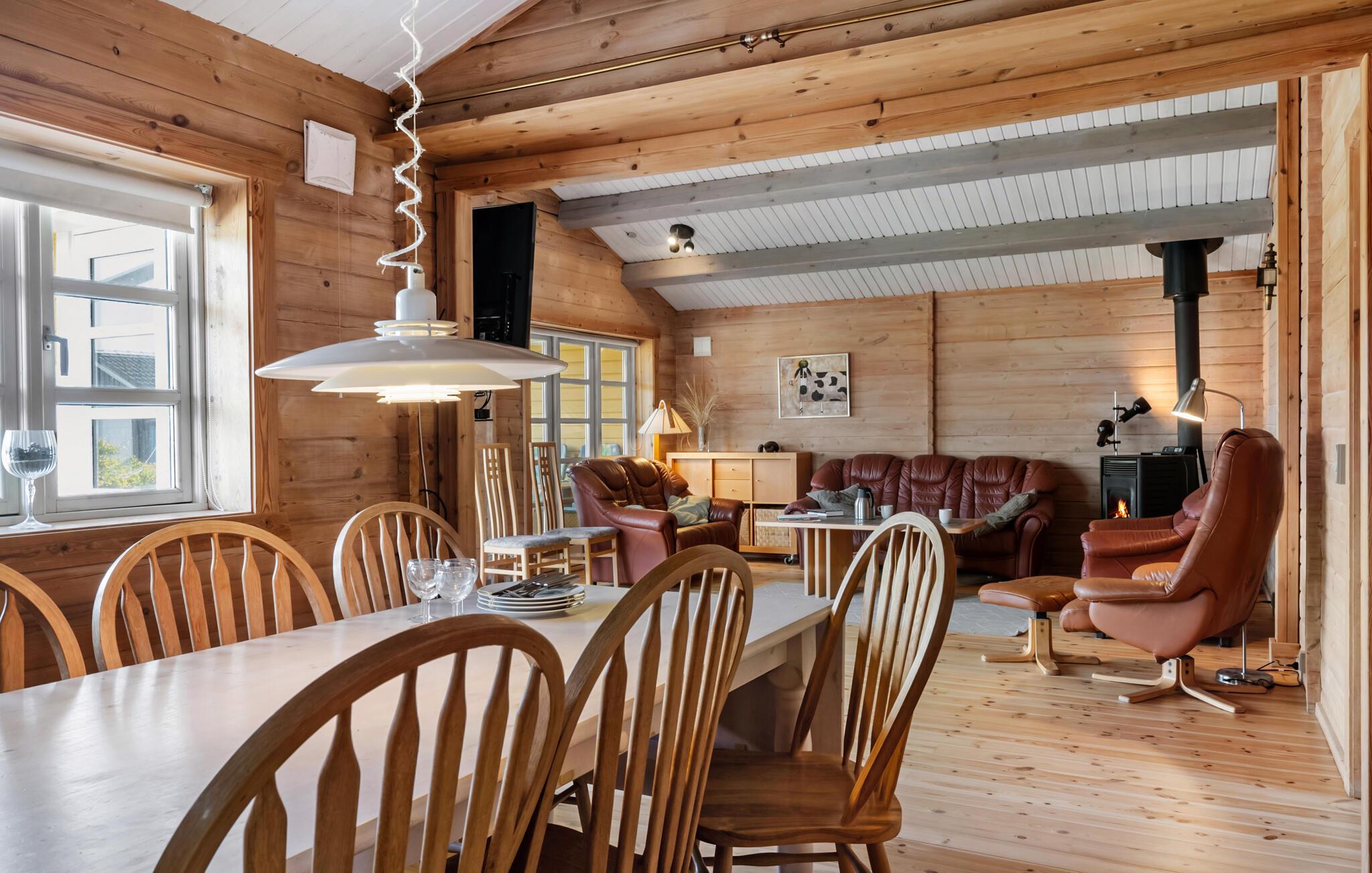 Træd indenfor og bliv betaget af den hyggelige atmosfære i dette rummelige feriehus, der lægger op til en uforglemmelig ferie med familien, kun en kort gåtur fra stranden. Glæd jer til at lave mad sammen i det indbydende køkken og hyggestunder i stuen. Lyt til den knitrende brændeovn, mens I spiller et brætspil eller stream en film, som alle nyder.