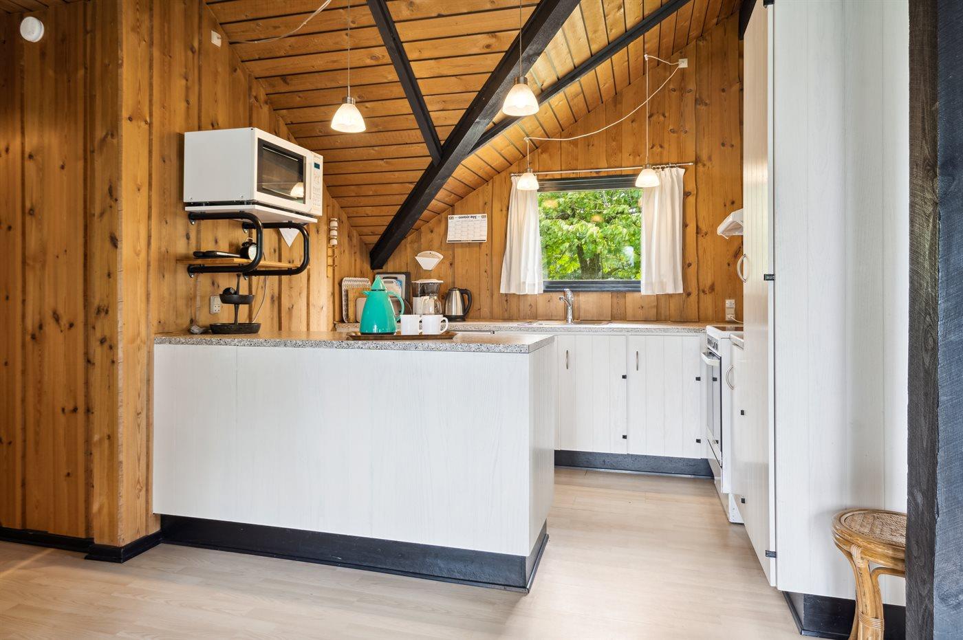 Køkkenet er udstyret med 1 køleskab. Der er 4 keramiske kogeplader, bageovn, mikrobølgeovn samt opvaskemaskine.