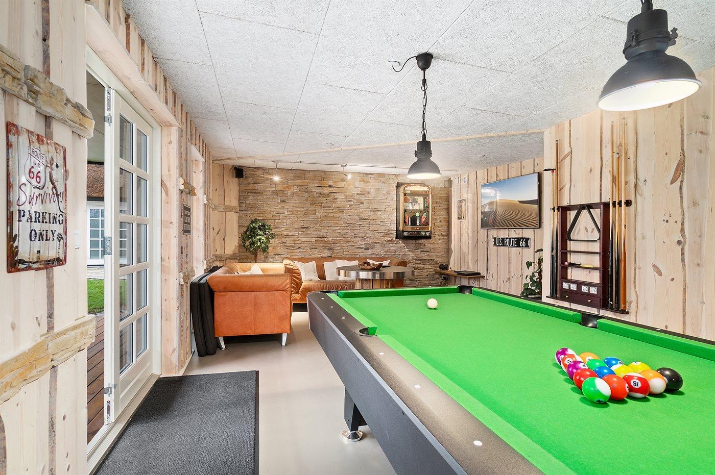Huset er bl.a. indrettet med en stor swimmingpool-afdeling med bar, TV, sauna, dampbad og en specialudfærdiget swimmingpool.