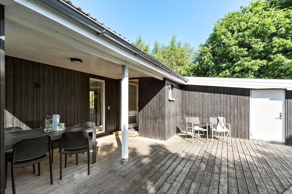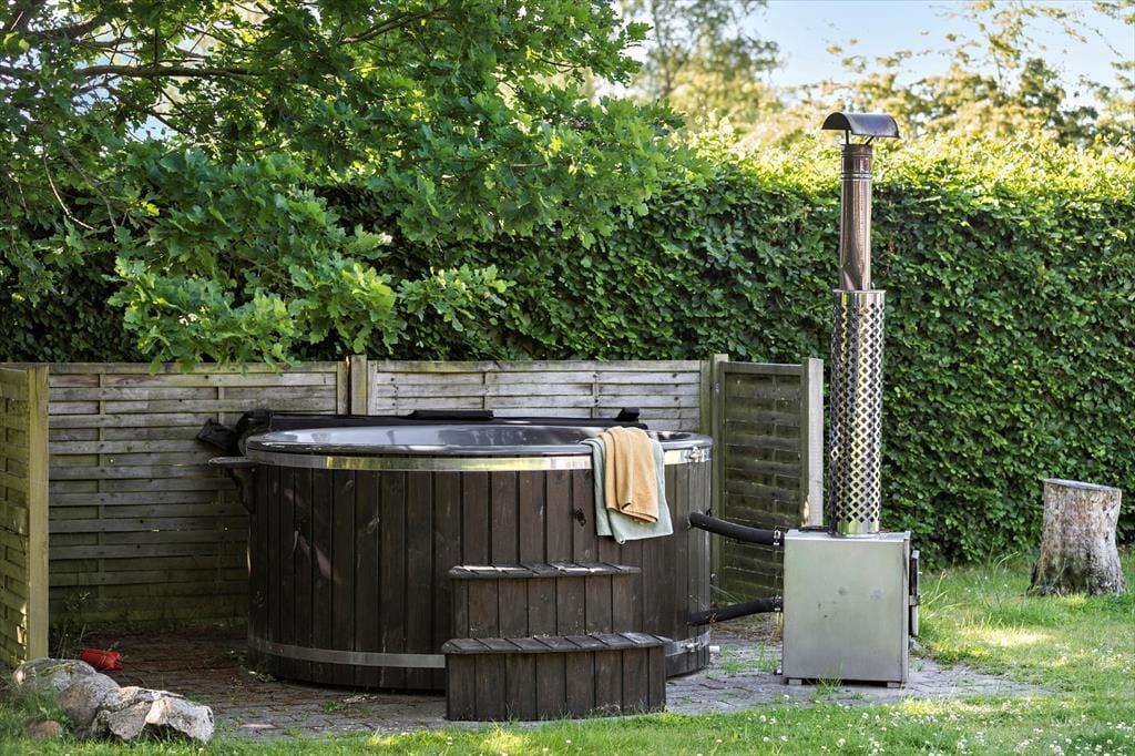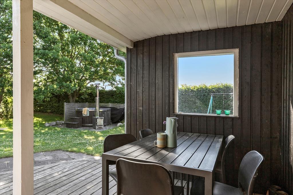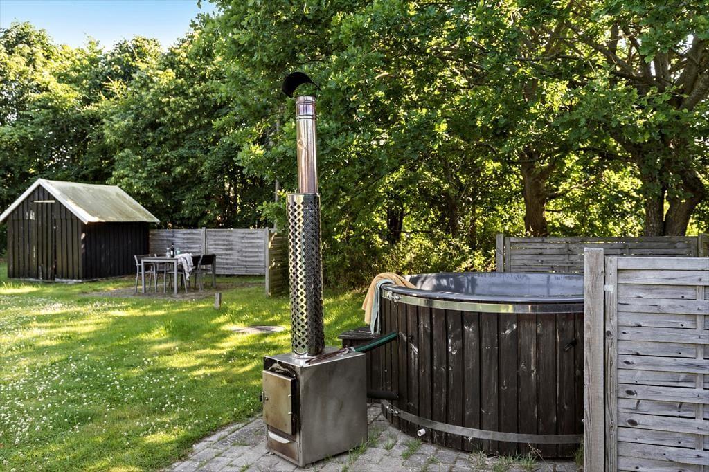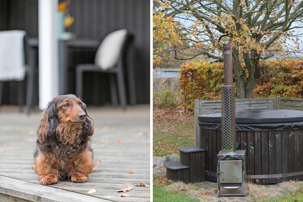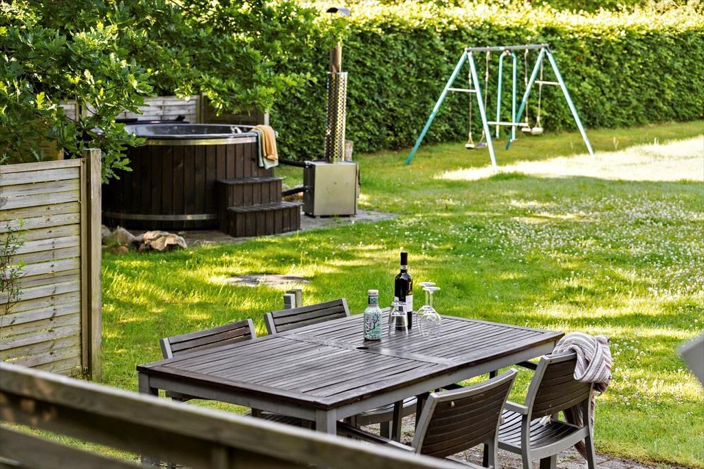 Nyd livet udenfor Nyd livet udenfor og mærk friheden på den store, åbne grund, hvor naturen bliver en stor del af ferien. Grunden er godt bevokset langs skellet, så I kan føle jer helt ugenerede, og på den overdækkede terrasse er der plads til lange, afslappede dage – uanset vejret. Herfra kan I nemt holde øje med både børn, hunde og vildmarksbadet, mens I selv slapper af. For de små eventyrere står gyngestativet klar til leg og latter, mens de voksne kan synke ned i vildmarksbadet og nyde en pause fra hverdagen under åben himmel. Og som prikken over i’et er der kun 800 meter til vandet. Så på ingen tid kan I stå med sand mellem tæerne og mærke den friste luft og havets bølger. Her er et udendørs liv, der passer til enhver – fra eventyr til ren afslapning.