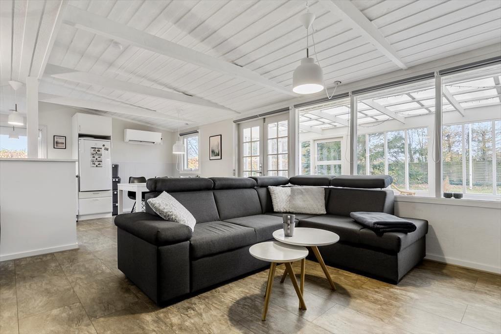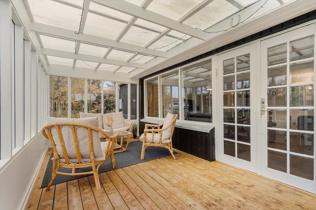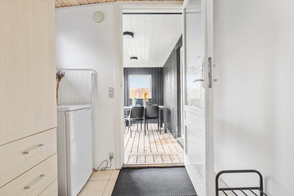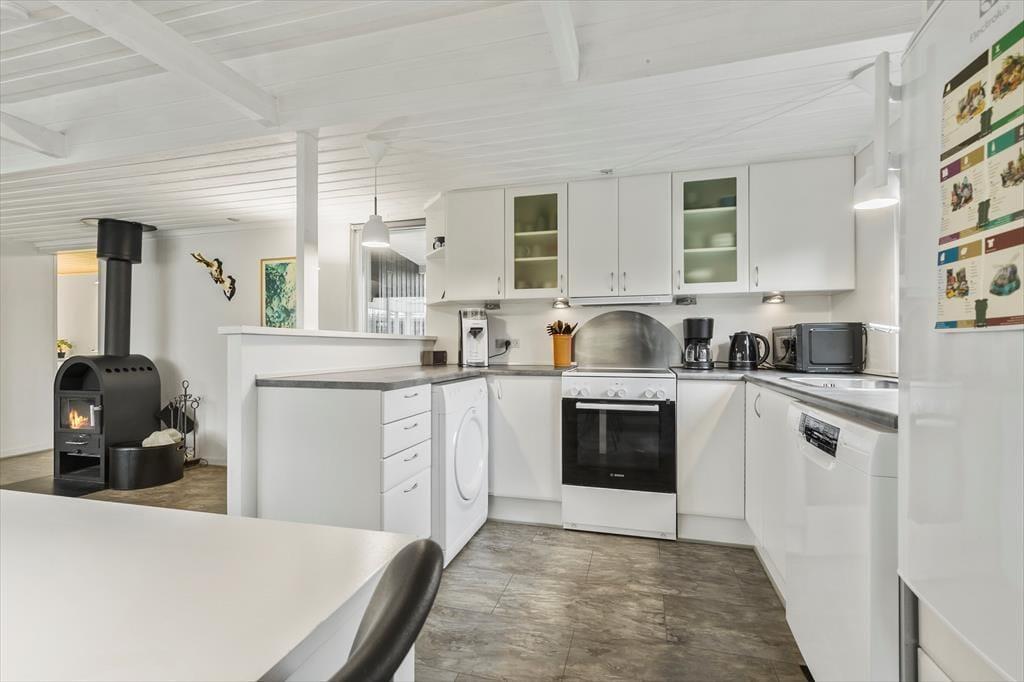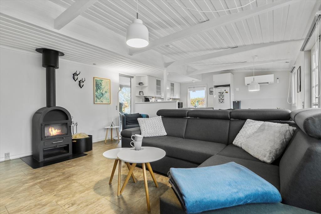 Velkommen indenfor Tænk jer et sommerhus, hvor tiden står stille, og hvor I kan læne jer tilbage og lade feriefølelsen tage over. Når I træder ind, møder I den varme atmosfære i det lyse opholdsrum, hvor stuen og køkkenet går ud i ét. Her er plads til grin, til samtaler over gryderne og til bare at nyde hinandens selskab og dagens oplevelser. Brændeovnen står klar til at sprede hygge og varme, når mørket falder på. Ildens glød danser blidt i baggrunden og skaber den helt særlige stemning, som kun en ferie i sommerhus kan. På de lyse dage kan I rykke ud i den charmerende udestue, hvor sollyset strømmer ind og naturen føles lige udenfor – en perfekt ramme for morgenkaffen eller en stille stund med en god bog. Sommerhuset har to hyggelige værelser: Ét med en dobbeltseng, hvor I kan vågne op til fuglesang, og et andet med både dobbeltseng og køjeseng – et oplagt tilflugtssted for både store børn og små familier. Badeværelset er enkelt og praktisk og der er vaskemaskine i entreen, så der er sørget for, at selv feriens praktiske sider kan ordnes nemt og hurtigt.