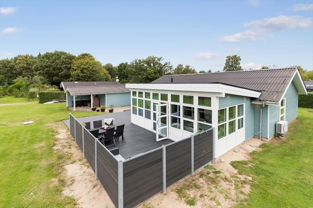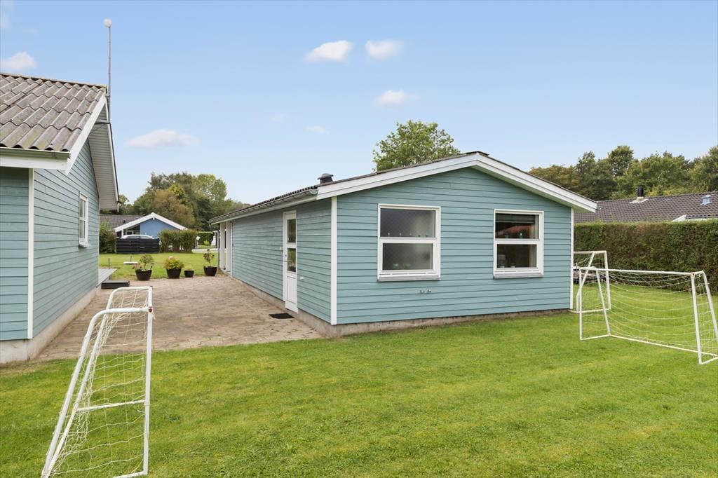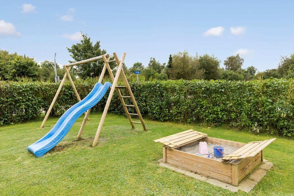 Nyd livet udenfor Udendørs venter en stor og ugenert terrasse med gode havemøbler, hvor du kan nyde feriens lækre måltider og slappe af under åben himmel. Haven er stor og plan og her er masser af god plads til leg og boldspil. Børnene kan gynge, så det kildrer i maven, lave lækre sandkager i sandkassen og hele familien kan spille fodbold og lave flotte verdensklassescoringer i fodboldmålene. 400 meter fra huset er der bålplads og shelter.