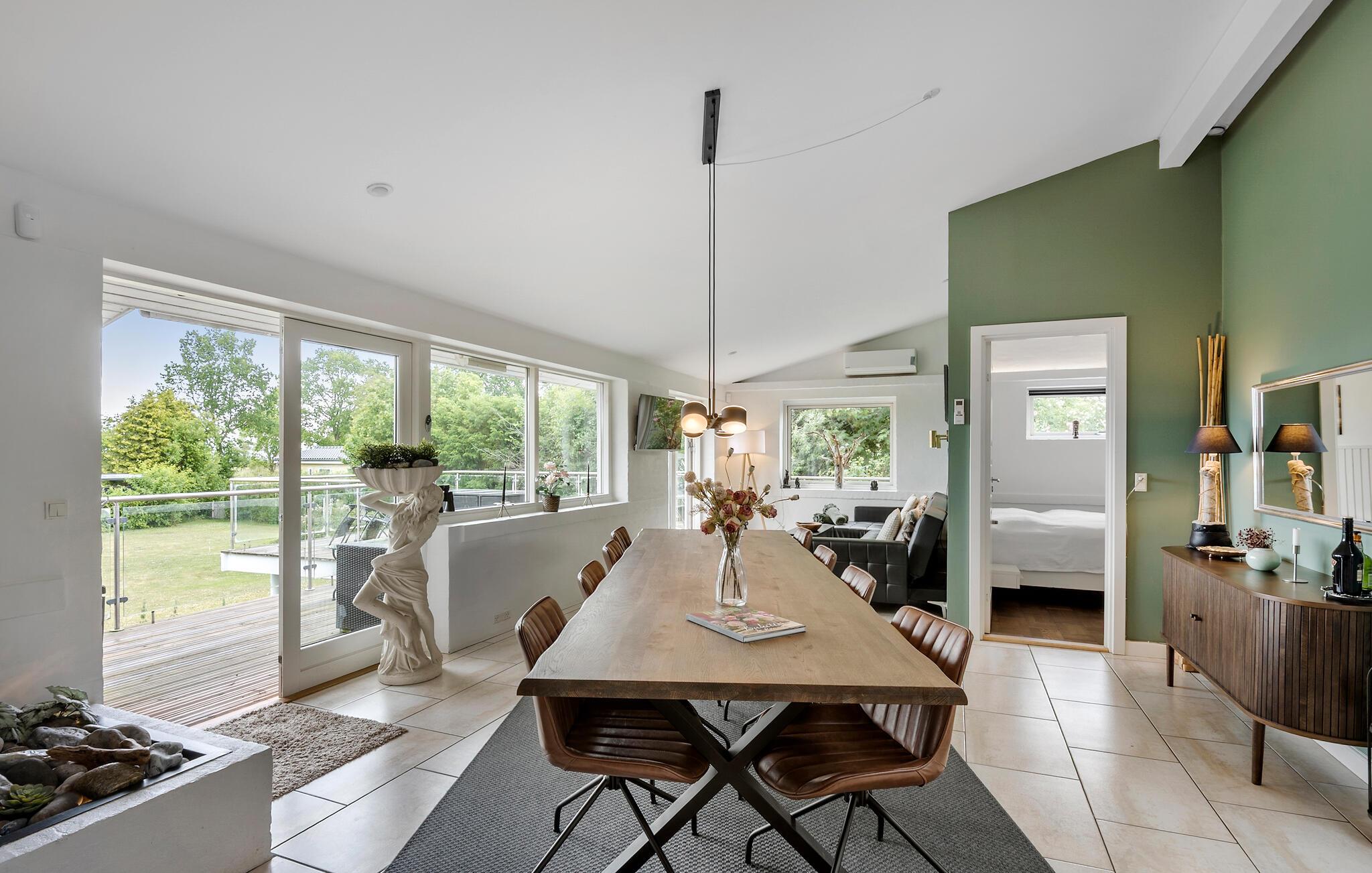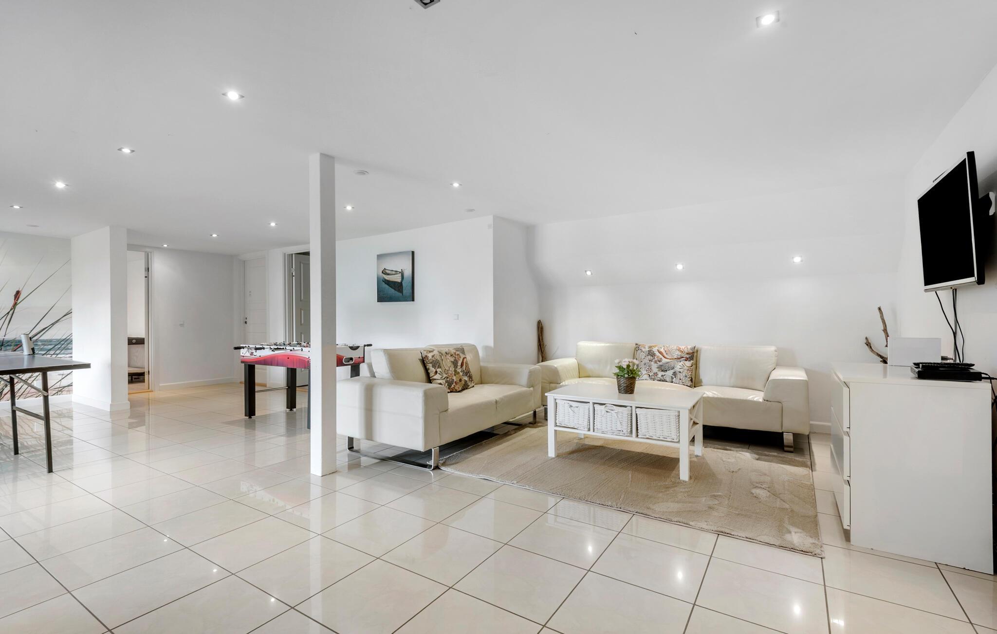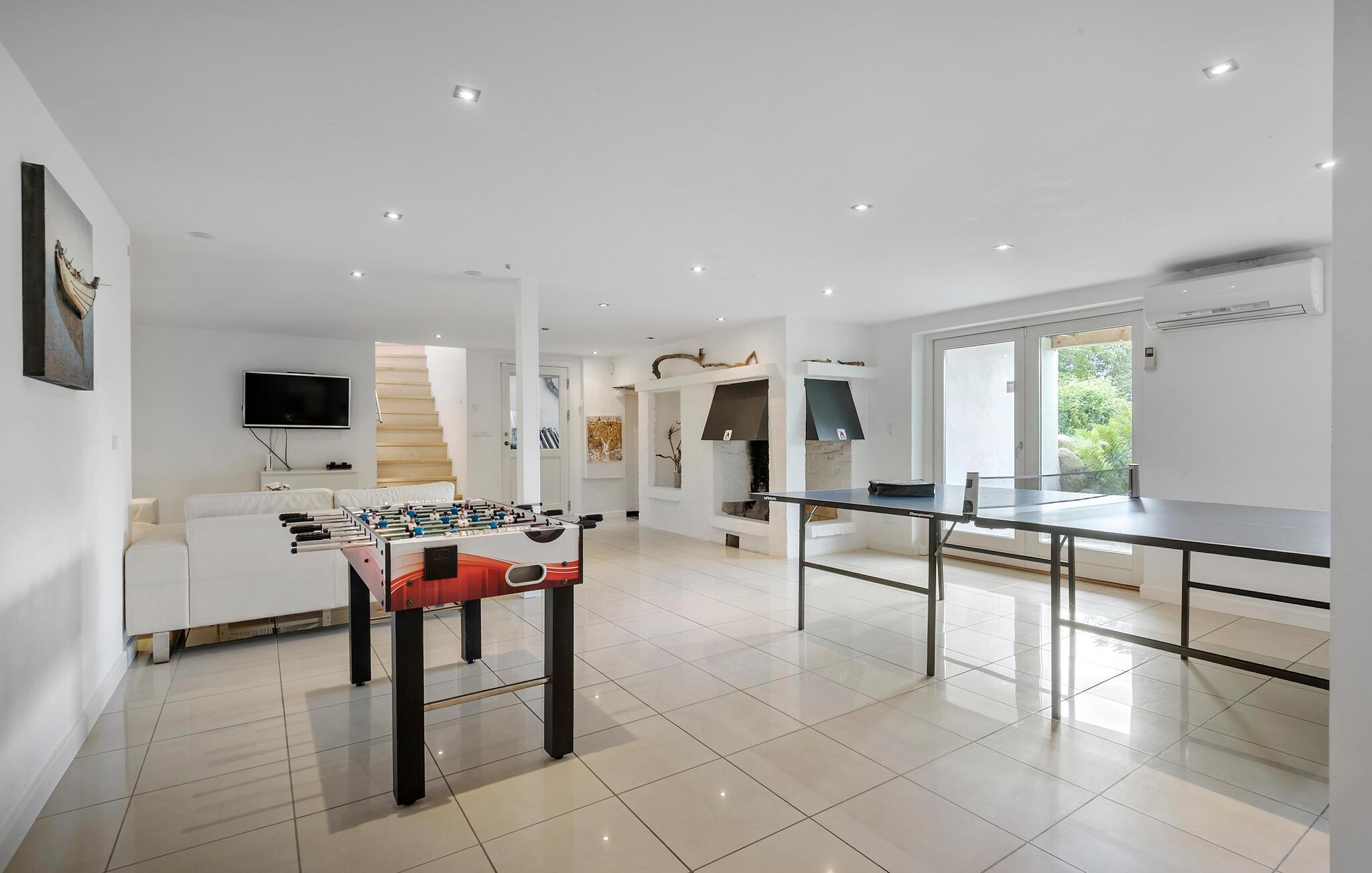 Kun 150 meter fra stranden finder I dette moderne og indbydende sommerhus men lækre faciliteter. Her venter jer lyse og åbne opholdsrum, som hurtigt vil blive jeres samlingssteder på ferien. Nyd skøn kvalitetstid sammen foran pejsen, spil kort eller læs gode bøger. TV-stuen lægger op til storslåede filmaftener, bare vælg en film og jeres favorit-snacks og sæt jer godt til rette. Feriens måltider nydes om det fine spisebord, eller hvad med at trække ud på terrassen, når vejret er til det. Her kan I starte dagen med en kop dampende kaffe, og planlægge jeres udflugter og aktiviteter mens børnene leger i haven. Senere kan I holde en lækker grillmiddag og nyde den lune sommeraften. Børn og barnlige sjæle vil elske aktivitetsrummet, hvor I kan udfordre hinanden til blandt andet bordfodbold og bordtennis. Efter en aktiv dag er det skønt at tage et spabad og komme helt ned i gear.