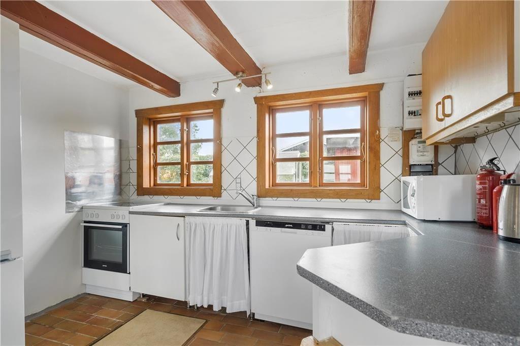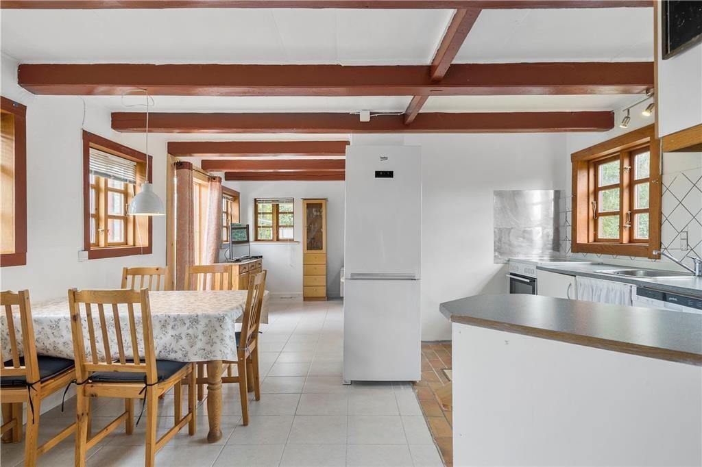 Køkken-alrum indeholder: EL-komfur med 4 kogeplader, ovn, opvaskemaskine, mikrobølgeovn, ekstra miniovn, køleskab med separat fryser og spiseplads