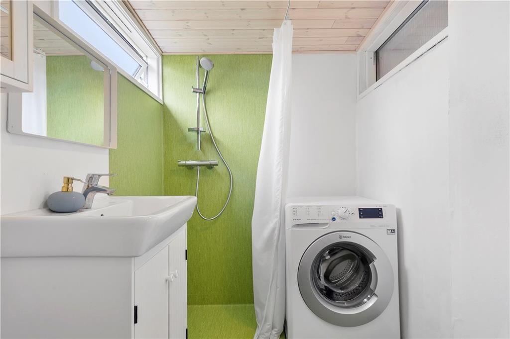 Badeværelse med toilet, håndvask, bruseniche og vaskemaskine