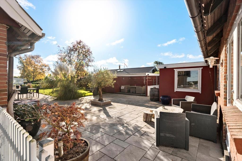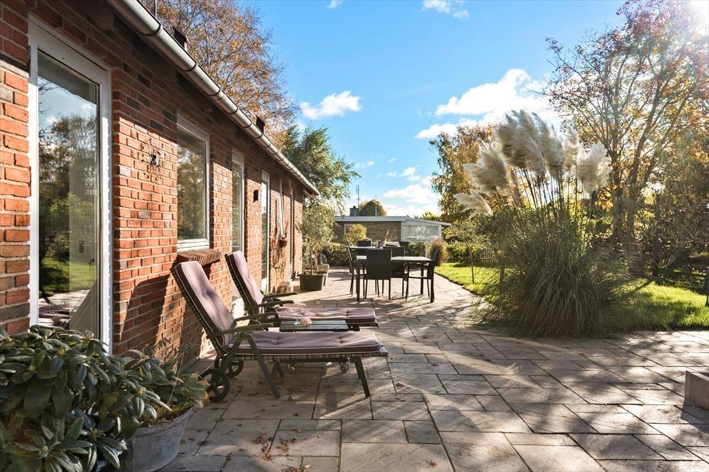 Skøn lukket have med gode siddepladser med havemøbler. Overdækket hyggelig terrasse. Stor gårdsplads / terrasse med fliser og smuk beplantning.