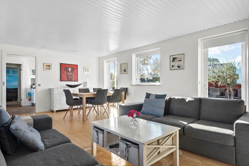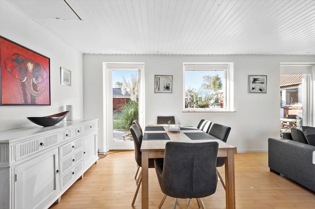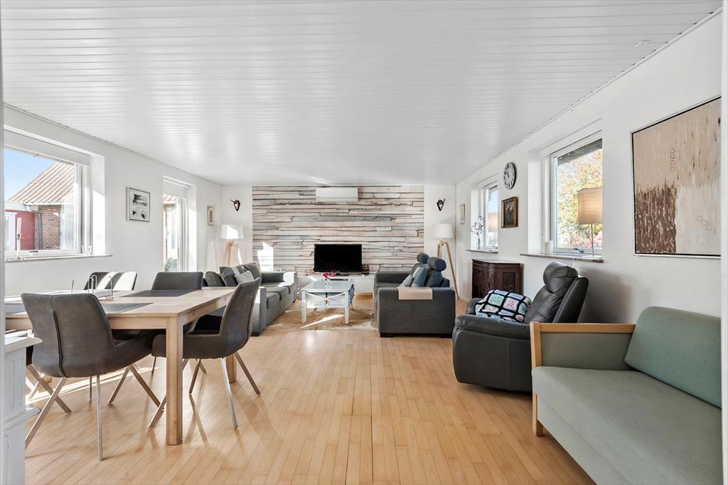 Pæn stue med spiseplads, sofagruppe, varmepumpe, TV og Chromecast, Internet samt 1 Dobbeltsovesofa