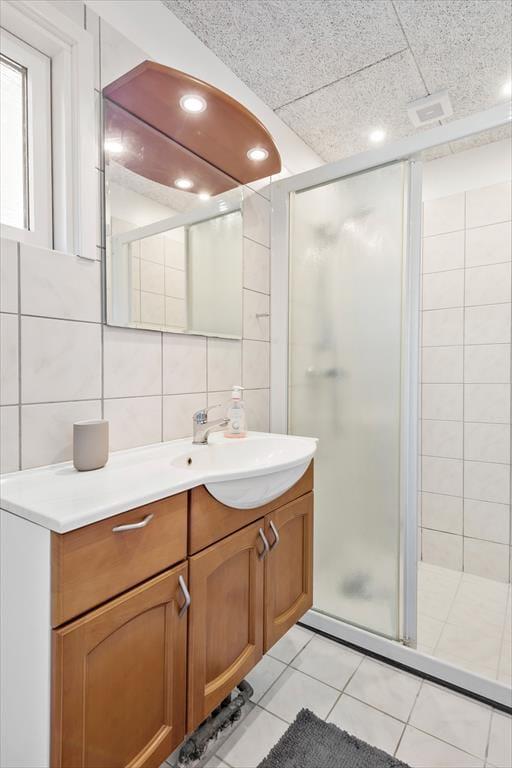 Pænt badeværelse med gulvvarme og stor bruseniche, samt håndvask og toilet.