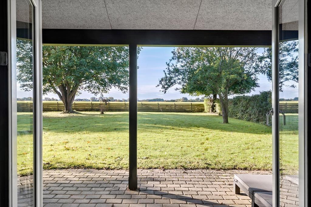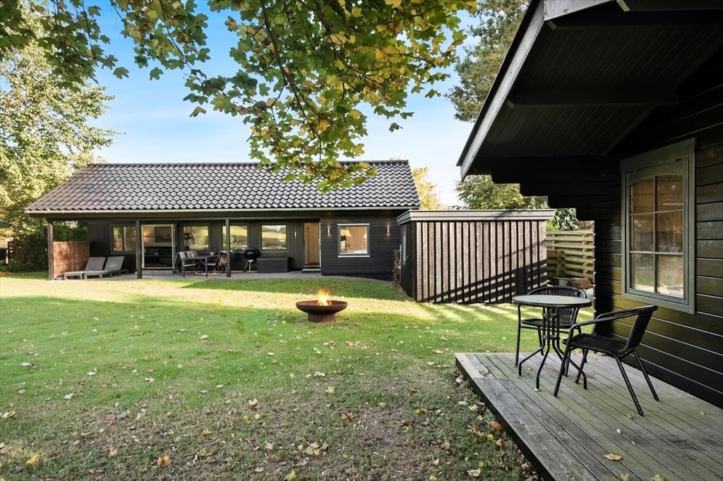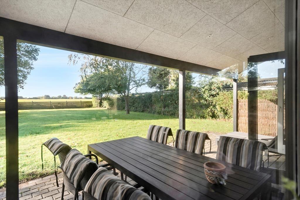 Sommerhuset er placeret på en stor grund med overdækket terrasse, på hele den ene side af huset