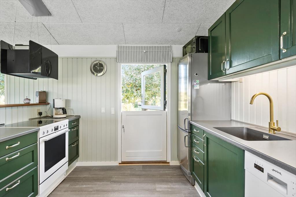 Pænt køkken med udgang til forhaven. Køkkenet er indrettet med køleskab og fryser,