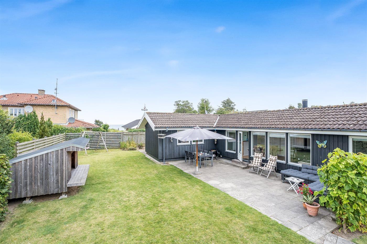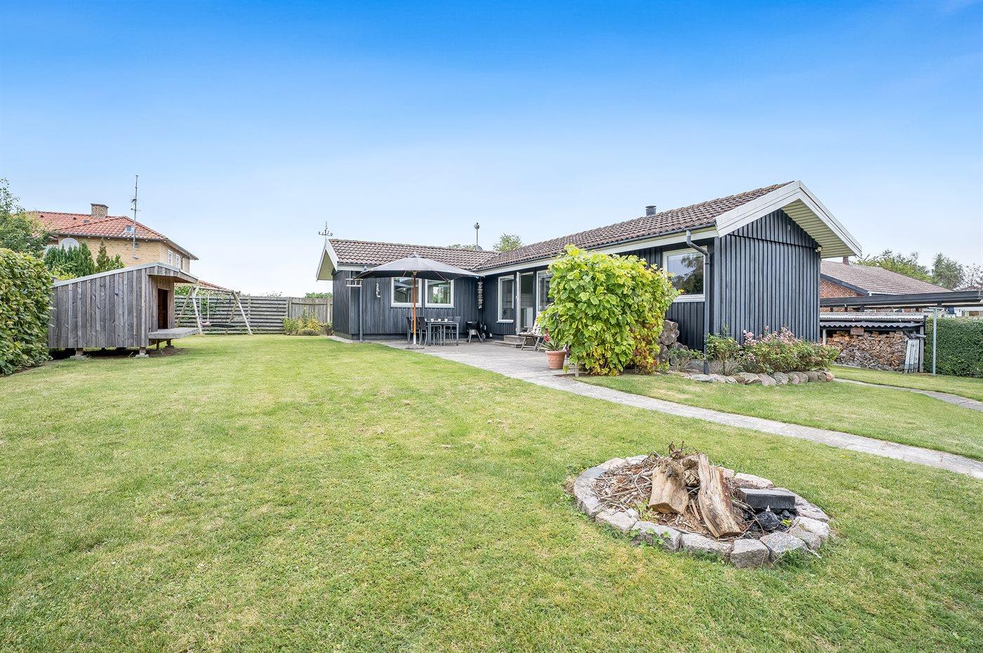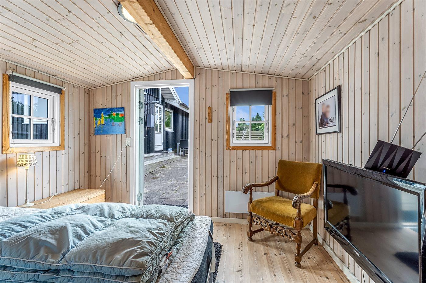 Sommerhus beliggende ca. 100 m fra strand med badebro, legeplads med gynger, vippe og rutsjebane og lille privat strand med adgang for husets lejere. Ved huset er der to dejlige terrasser.