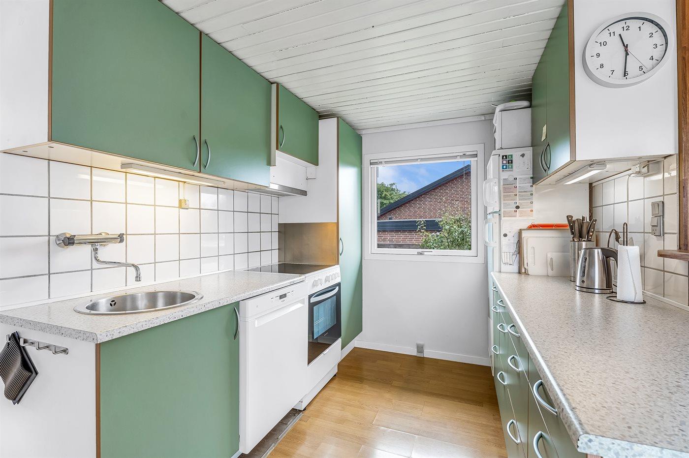 Køkkenet er udstyret med 1 køleskab. Der er 4 elkogeplader, varmluftovn, mikrobølgeovn samt opvaskemaskine.