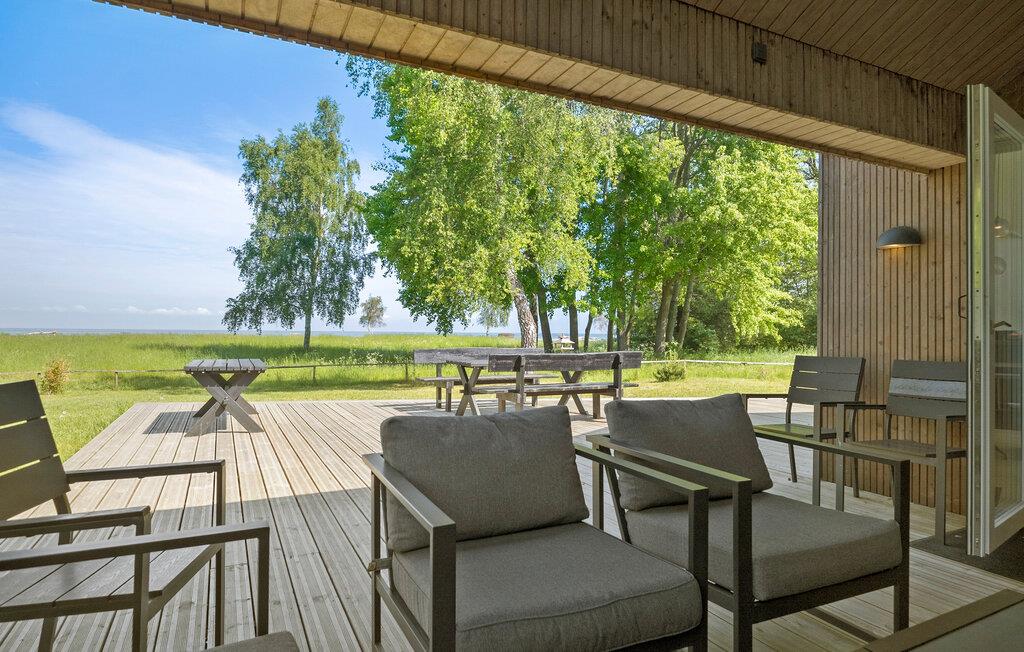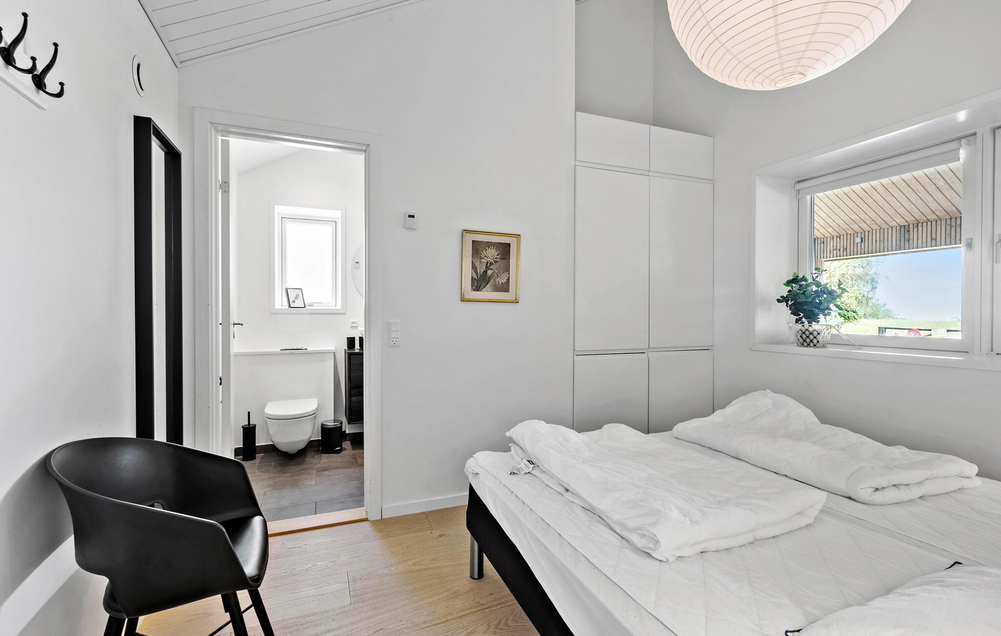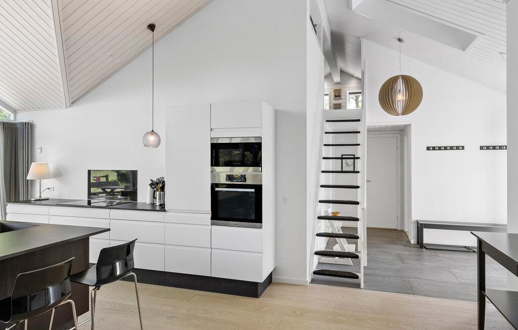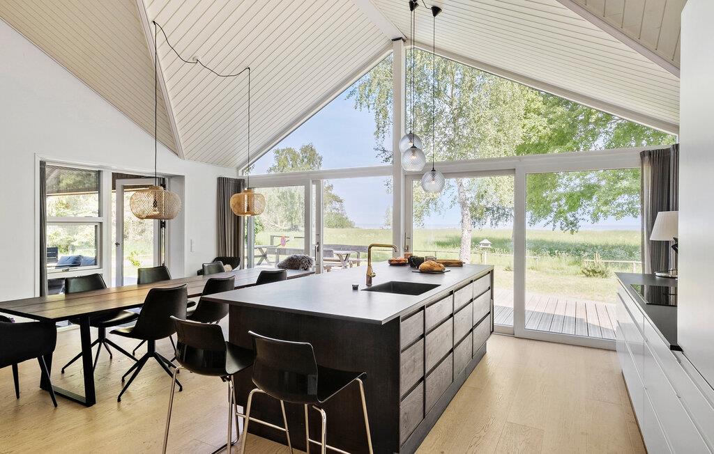 Velkommen til dette virkelig indbydende hus, der ligger i absolut dejlige omgivelser og byder på god plads til en ferie med den udvidede familie eller måske to vennefamilier. Interiøret fremtræder elegant og stilsikkert med gennemtænkte indretningsløsninger, højt til loftet og store vinduespartier, der giver det indre et lyst, lækkert og luftigt udtryk. Nyd godt af det komfortable møblement og det veludstyrede køkken, hvor familiens kokke kan kræse om livretterne, inden der dækkes op til det store festmåltid ved spisebordet med udsigt helt ud til vandet.