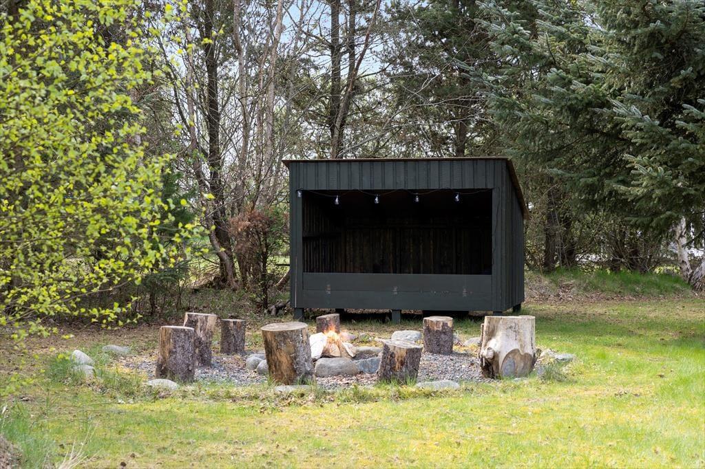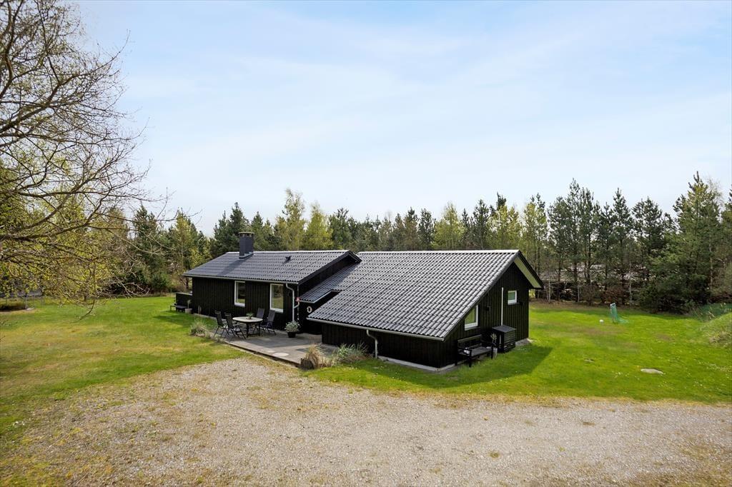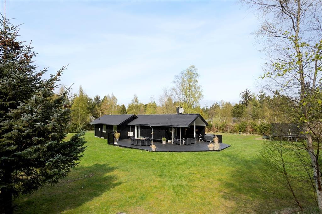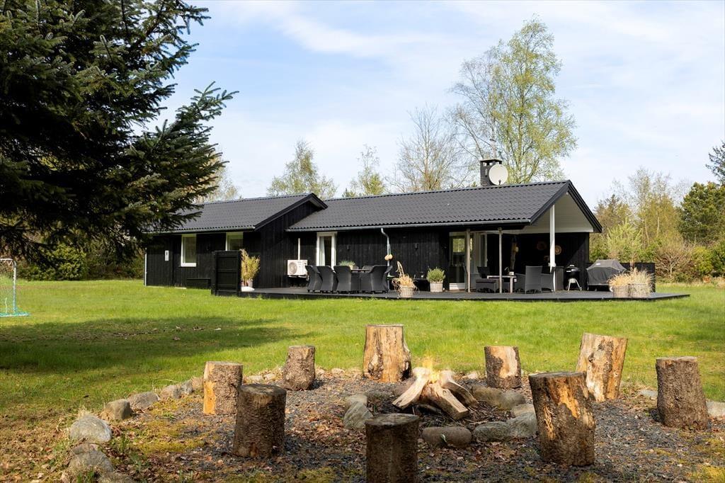 På den store og ugenerede naturgrund kan du nyde ferien i fuld frihed. Her er både plads og ro til at trække vejret dybt og lade feriefølelsen bundfælde sig. Terrassen breder sig rundt om huset, så du altid kan finde en solplet eller et sted i skyggen – uanset tidspunktet på dagen. På græsplænen er der masser af plads til leg og boldspil, og når mørket falder på, kan I samles omkring det hyggelige bålsted med snobrød, varme tæpper og stjerner på himlen. For børnene – og eventyrlystne sjæle – byder haven også på et shelter, hvor man kan sove under åben himmel og lytte til nattens lyde fra skov og strand. Her får I med andre ord ikke bare et sommerhus, men en hel ferieoase under åben himmel – og det hele ligger trygt og godt omkranset af grøn bevoksning og fredelig natur.