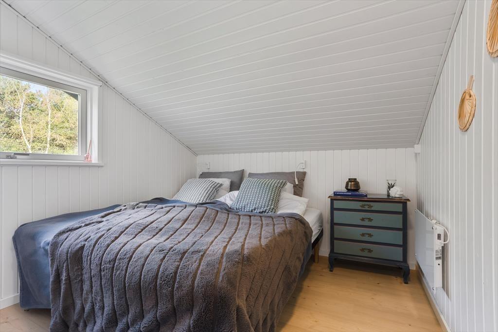 Når du træder indenfor i dette skønne sommerhus, er det første, der møder dig, en lys og imødekommende atmosfære. Huset er nyrenoveret med respekt for det klassiske sommerhusliv, og de lyse overflader, store vinduespartier og venlige farver giver en følelse af luft, rummelighed og nærhed til naturen. Den åbne stue byder på et hyggeligt sofaområde, hvor du kan synke ned med et tæppe og en god bog, mens brændeovnens knitren varmer stuen op og skaber en afslappet stemning. Køkkenet ligger i åben forbindelse med stuen, så hele familien kan være sammen, selv når der skal laves mad – og ved spisebordet er der plads til lange måltider og gode feriesnakke. Sovepladserne er fordelt på værelser, der inviterer til god nattesøvn og afslapning efter en dag fyldt med oplevelser, mens badeværelset er enkelt og funktionelt indrettet med alt, hvad I skal bruge i hverdagen.