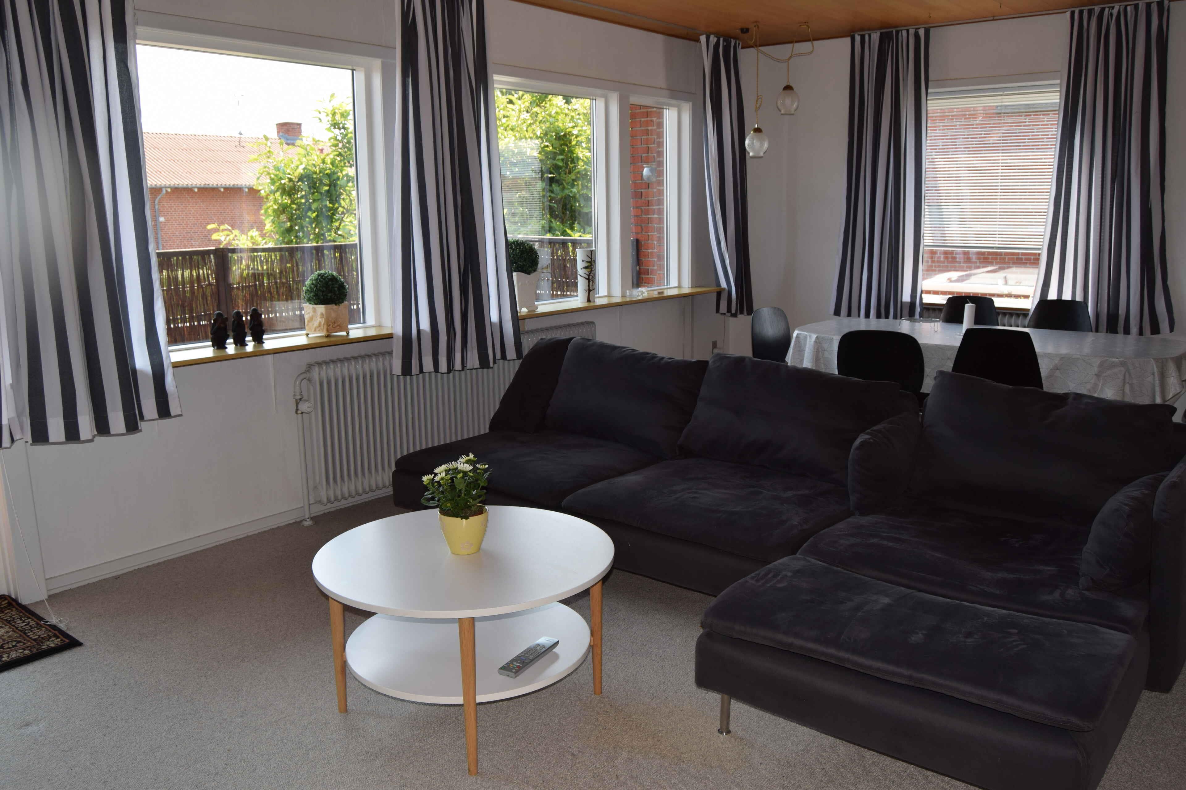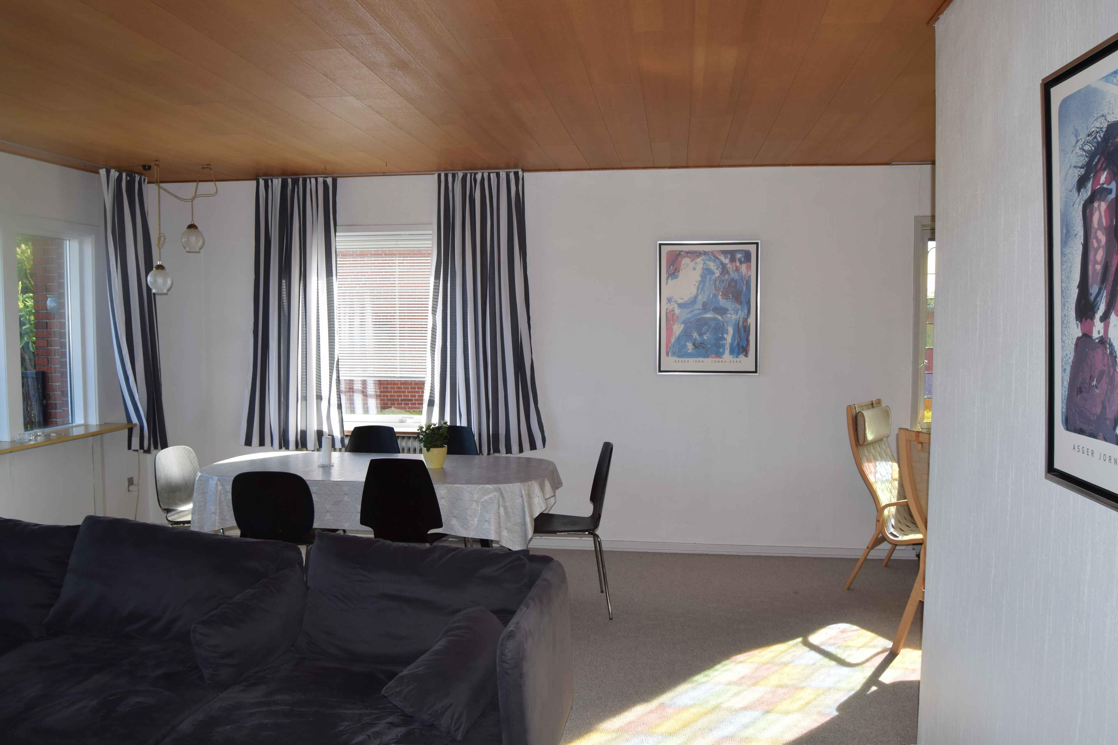 Dette charmerende byhus ligger i den idylliske fiskerlandsby Strandby ca 10 km nord for Frederikshavn og ca 35 km syd for Skagen. I Strandby finder du flere restauranter som tillige tilbyder take-away, hvis i hellere vil spise hjemme. Ikke overraskende er specialiteterne især fiskeretter, da fiskeauktion bliver afholdt hver morgen, hvilket garanterer friske fisk hos de lokale. Hvis i er mere eventyrlystne kan i købe sprællende frisk fisk hos de lokale fiskehuse. I gåafstand fra boligen finder i 2 fine sandstrande. Nordre strand som har blåt flag og toilet faciliteter, og den mere private og mindre travle Søndre strand, som også er perfekt til lange gå ture. En kort køretur eller 7 minutter med toget, og i er i Frederikshavn med en overflod af indkøbs og spisemuligheder. 30 minutter i bil eller tog, og i befinder jer i Skagen med alt hvad denne by har at tilbyde. Huset er et pænt byhus fra 50'erne med 2 soveværelser, stor og meget lys stue med spiseplads til minimum 6 personer. Der er en sovesofa og et yderligere værelse i kælderen hvor der er yderligere 2 sengepladser. Et pænt badeværelse med brusebad, og et veludstyret køkken. En terrasse med udgang fra stuen får morgensol, og er perfekt til at nyde morgenkaffen. Bag huset er en lille private have med et overdækket område som får eftermiddags og aftensolen. Perfekt til at nyde noget koldt efter en dag på stranden.