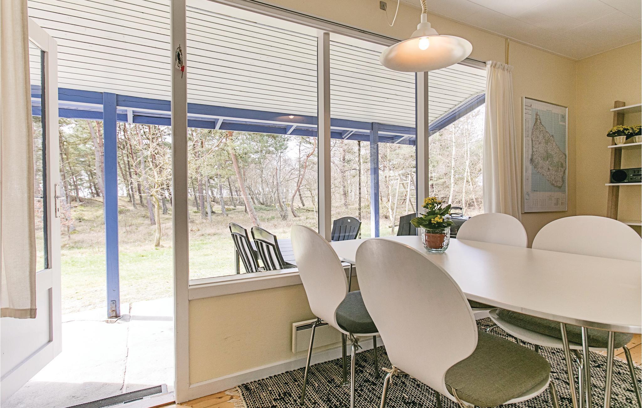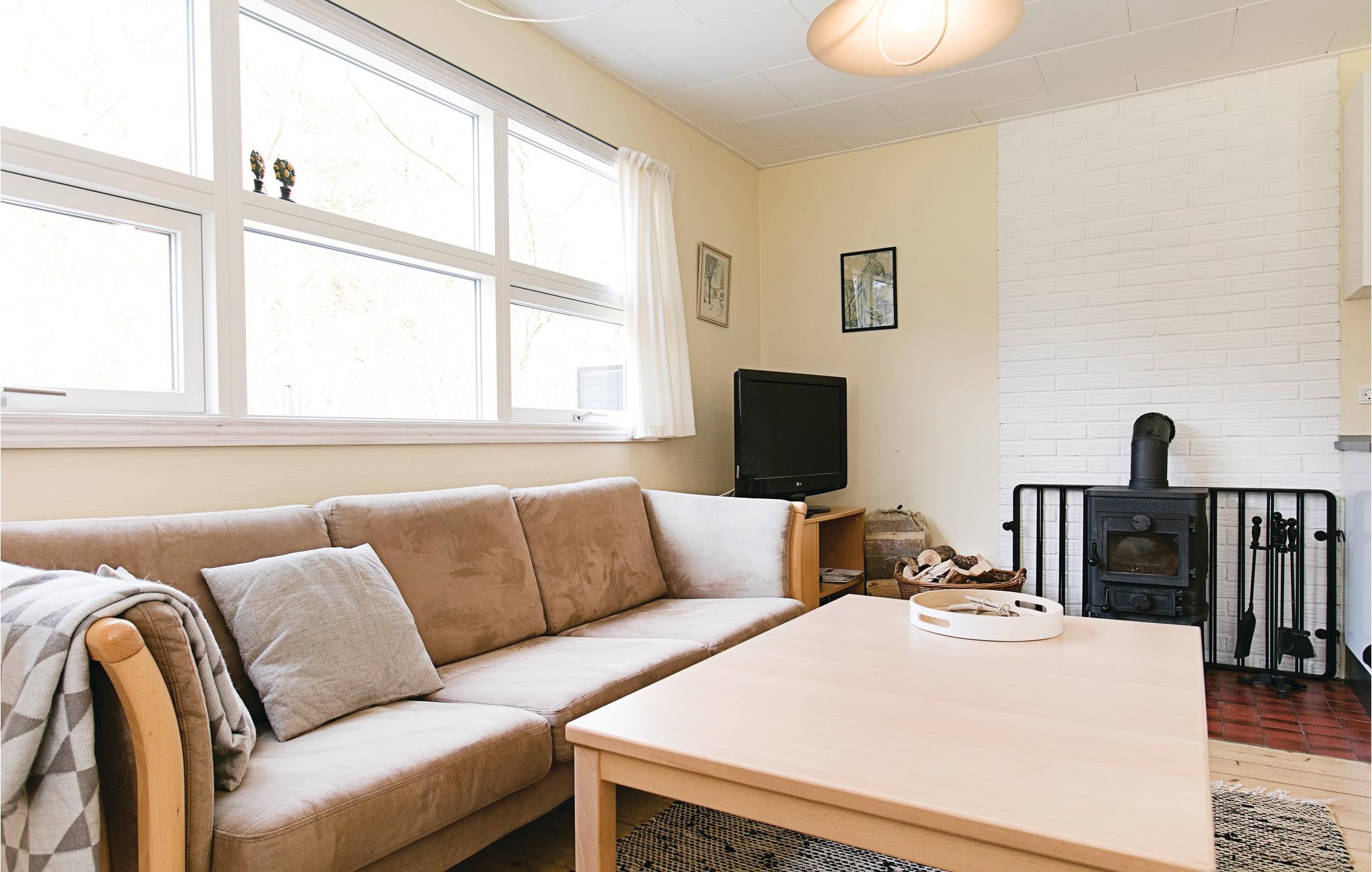 Hyggeligt træhus nær stranden på Bornholm med åben og overdækket terrasse samt brændeovn.