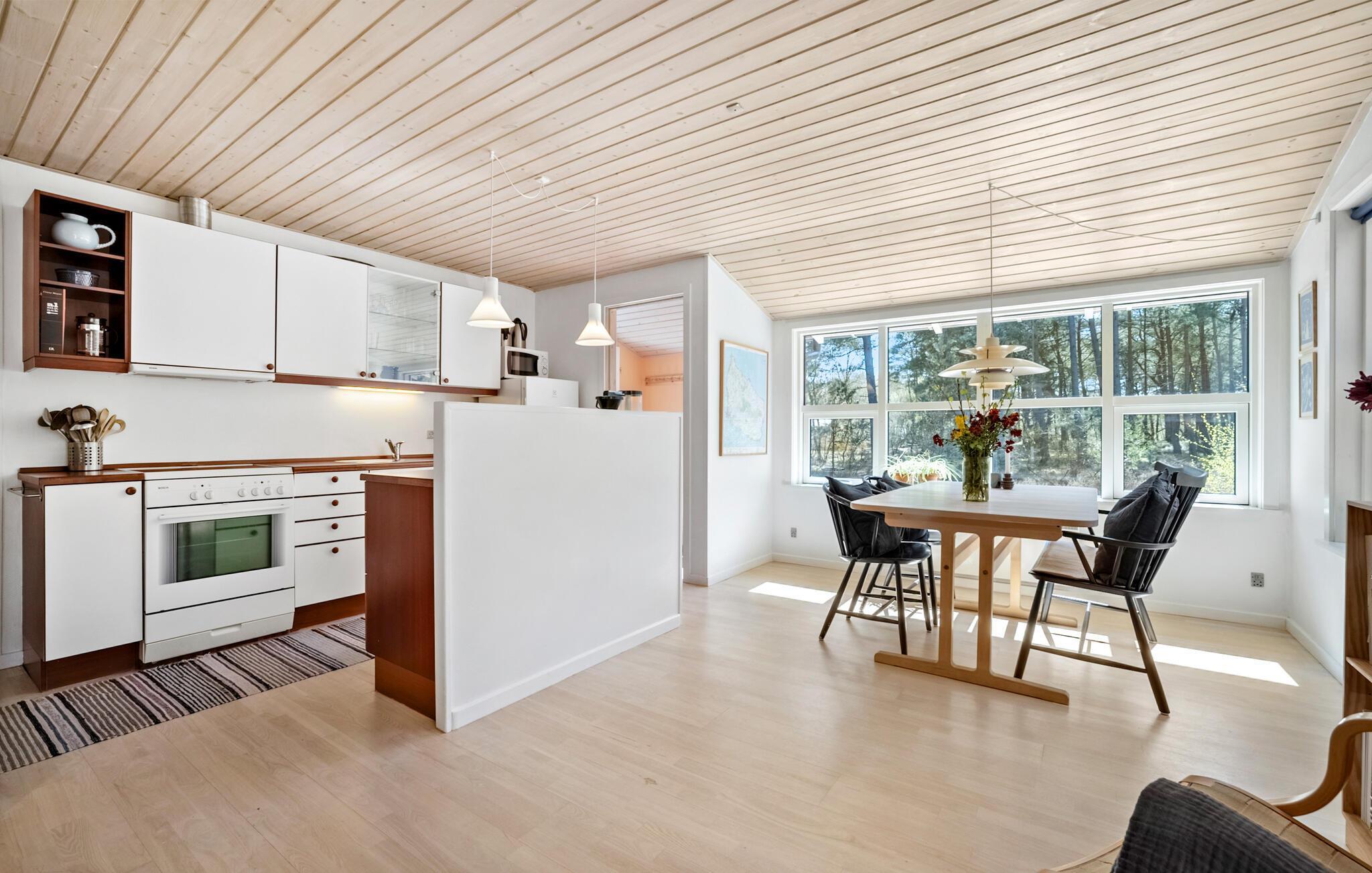 Det naturlige samlingspunkt er den kombinerede opholds- og spisestue med åbent køkken. Her kan I slænge jer i komfortable møbler, se fjernsyn, høre radio eller musik, spille spil og bare hyggesnakke. Om vinteren kan I nyde varmen og hyggestemningen fra brændeovnen.