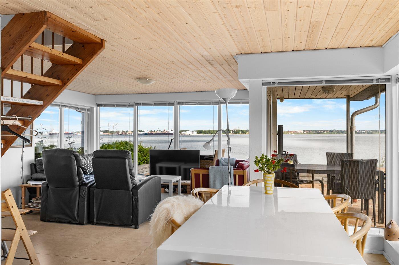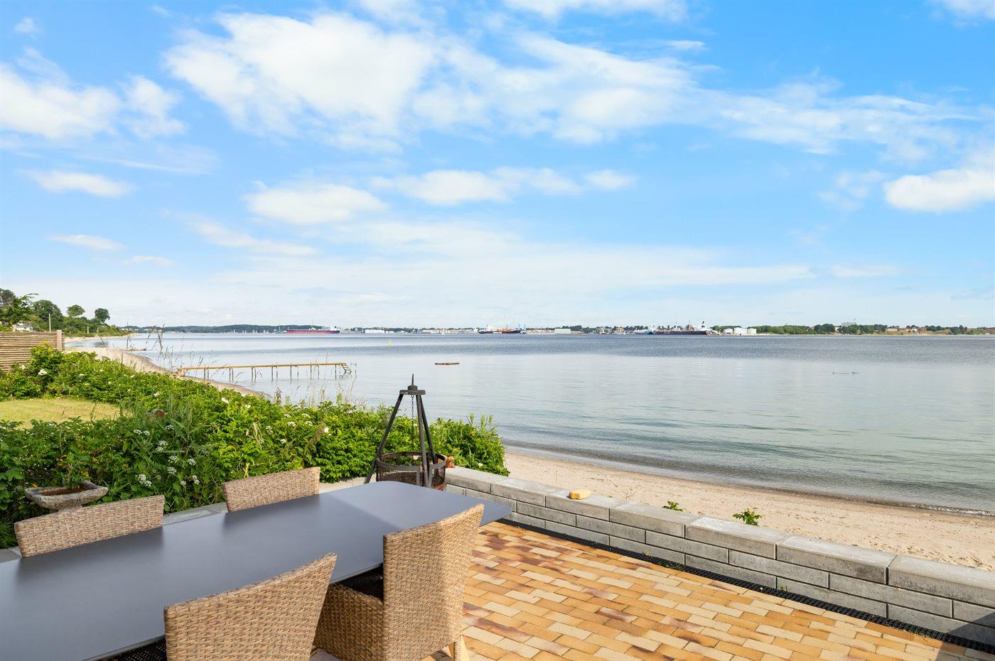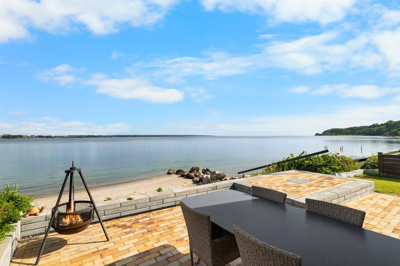 Fra huset er der direkte udgang til terrassen, hvorfra man efter få trin er på stranden! På terrassen kan man sidde i det store udendørsspa og nyde udsigten. Det samme kan man inde fra huset og fra soveværelset på 1.sal.