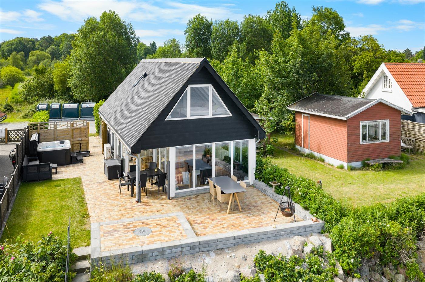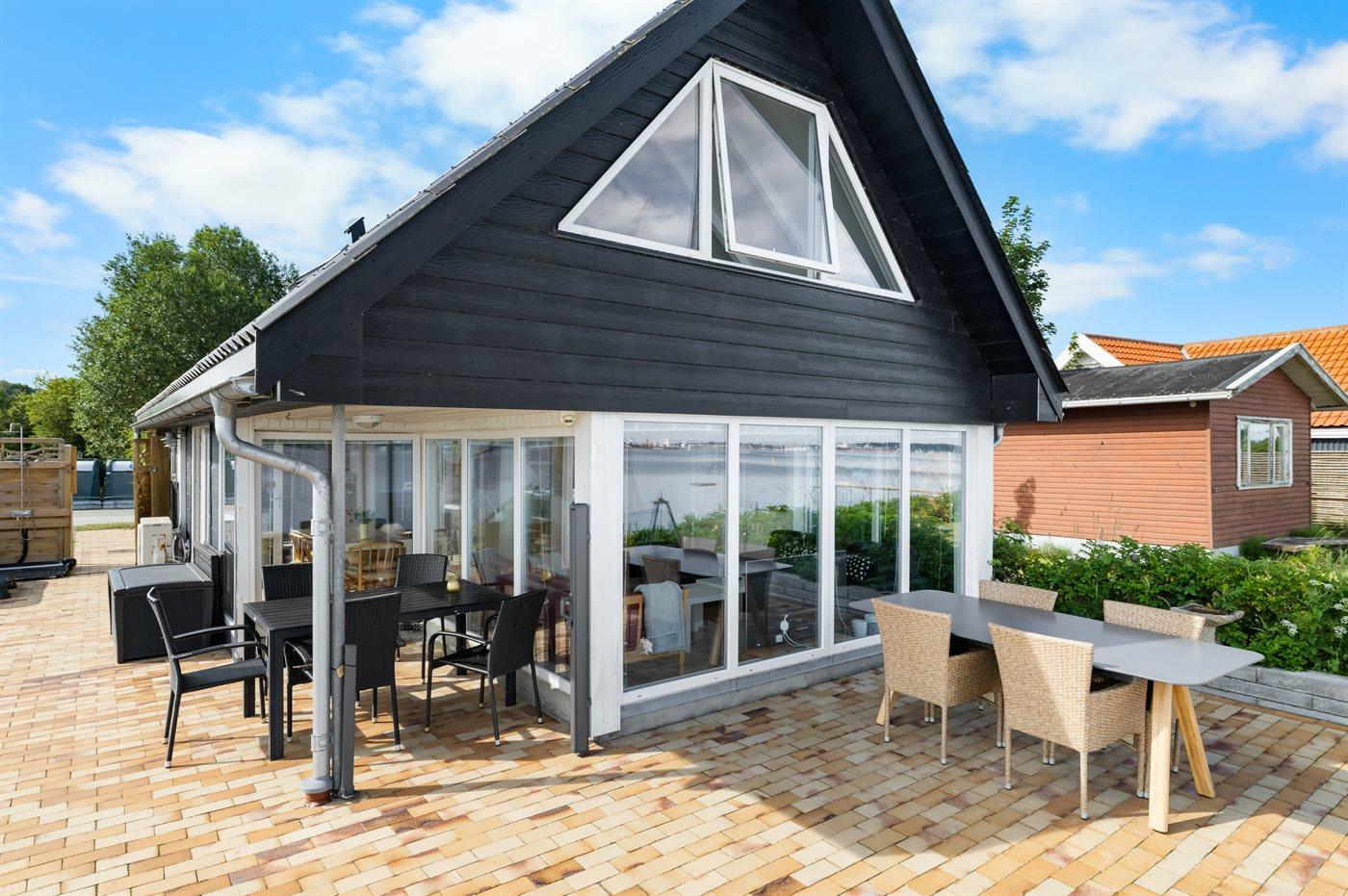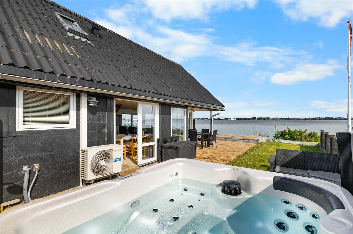 Hyggeligt sommerhus ved Lillebælt med 180 graders havudsigt og direkte adgang til strand og spa.