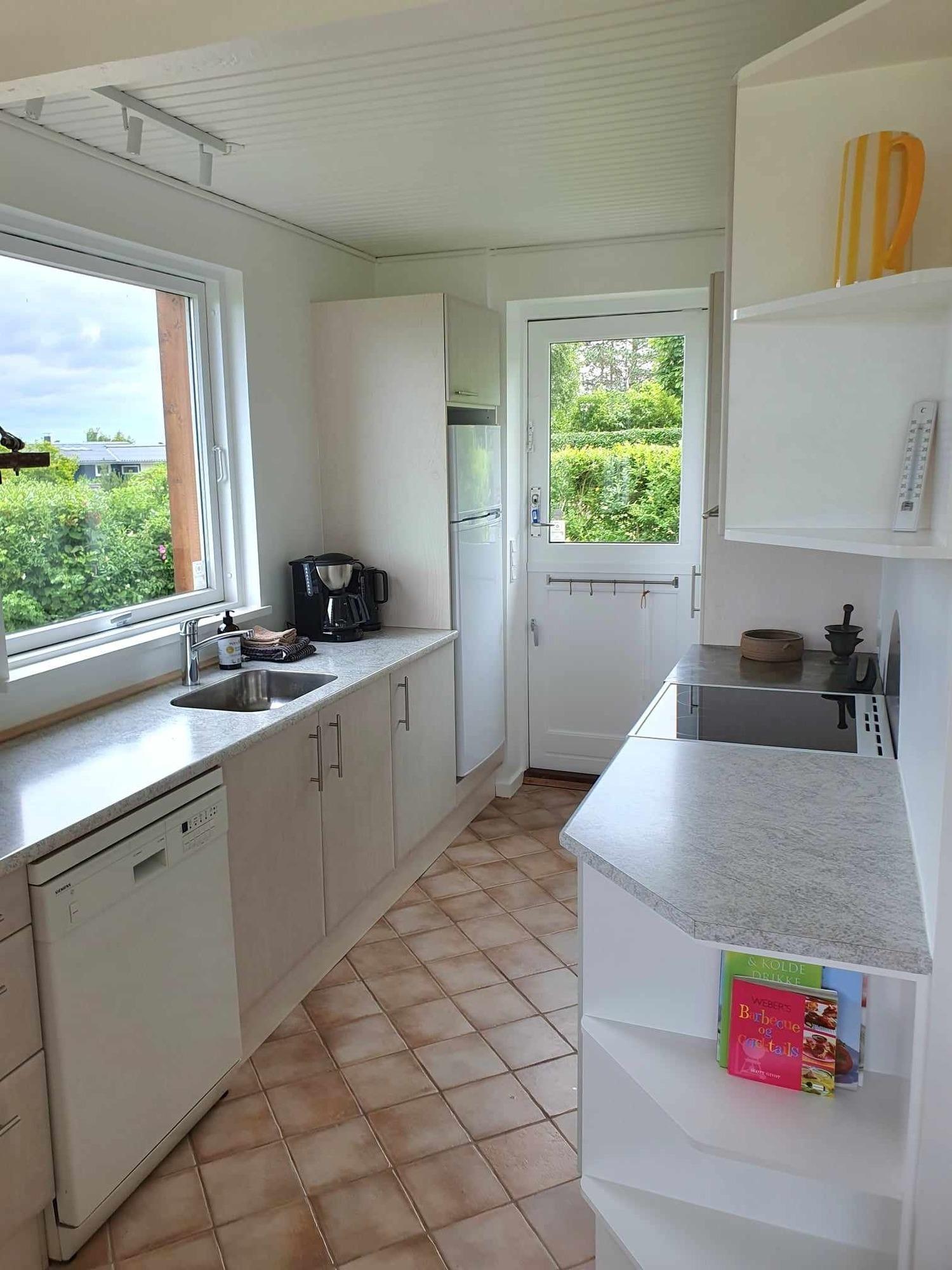 In der Küche gibt es einen Kühlschrank, einen Backofen und einen Geschirrspüler.