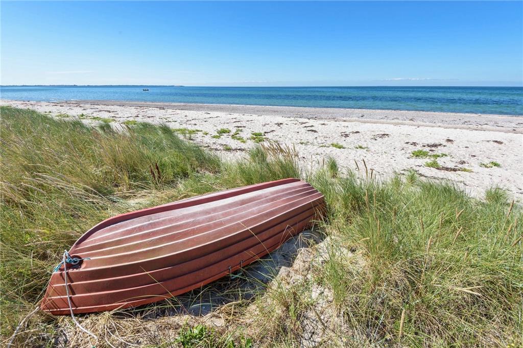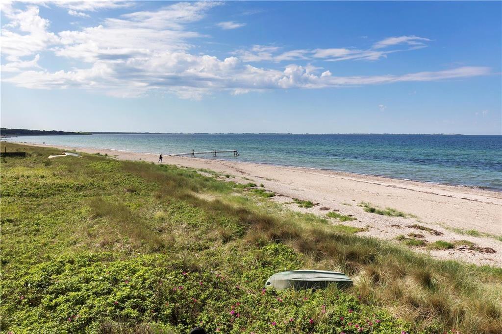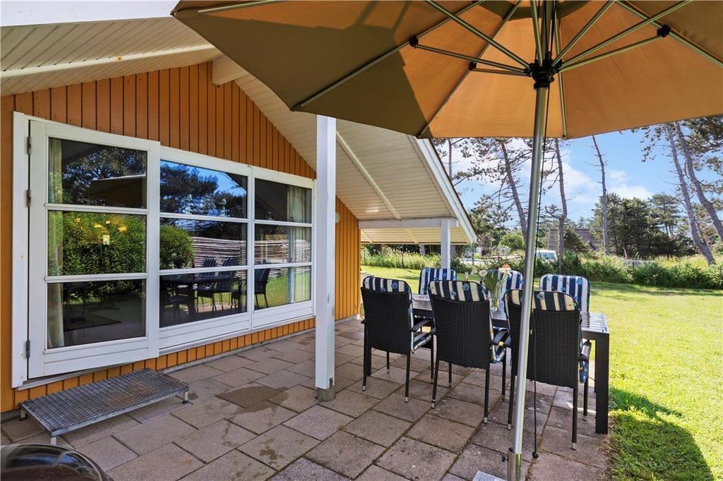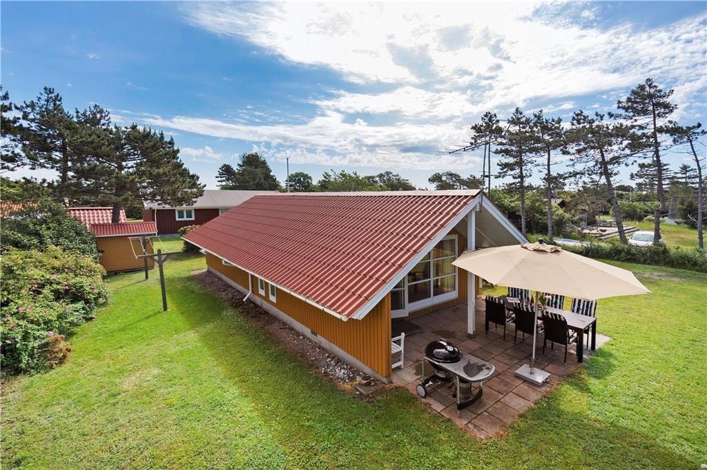 Huset har en 681 m2 grund med to fliseterrasser hvorfra der er havkig. Ved feriehuset er der havemøbler, parasol og grill.