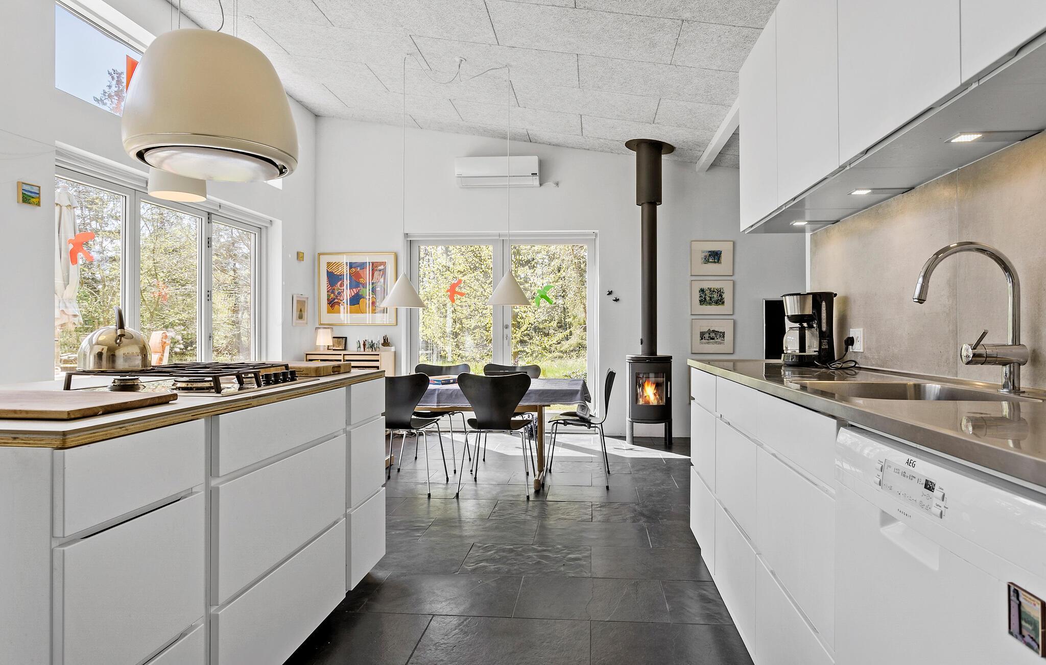 Velkommen til Svankjær, hvor I i dette dejlige hus får den perfekte base for en begivenhedsrig ferie med familien. Indvendigt emmer det af kvalitet over hele linjen med lækre lysindfald gennem de store vinduespartier, samtidig giver en dejlig udsigt til haven. Interiøret prydes af pæn kunst på væggene og et komfortabelt møblement, der gør det nemt at sænke skuldrene og slappe af med det samme, I ankommer. Hvis vinden bider lidt fra sig, kan I tænde op i brændeovnen, der giver varme og et knitrende lydtapet til madlavningen i det veludstyrede køkken, måltiderne ved spisebordet og aftenhyggen i sofahjørnet.