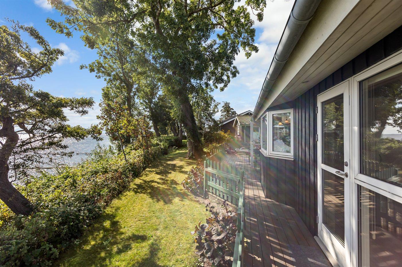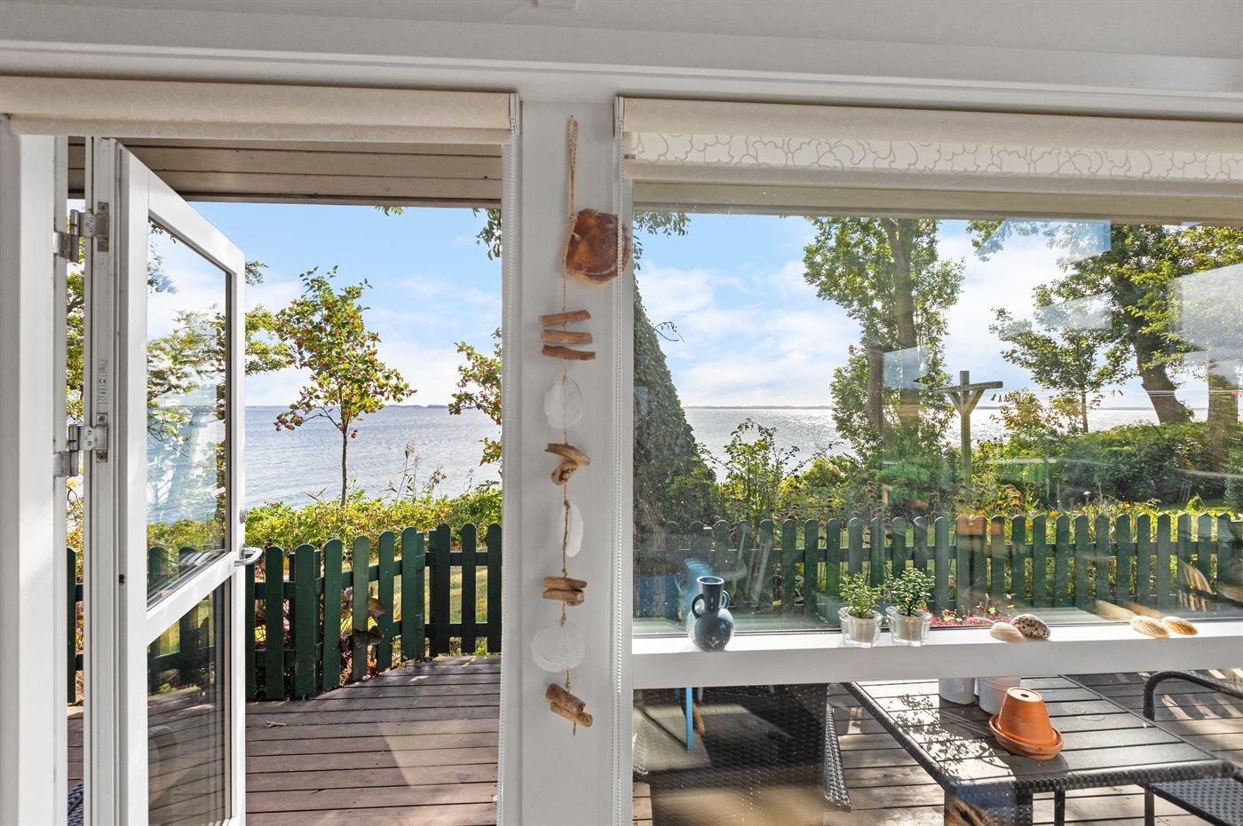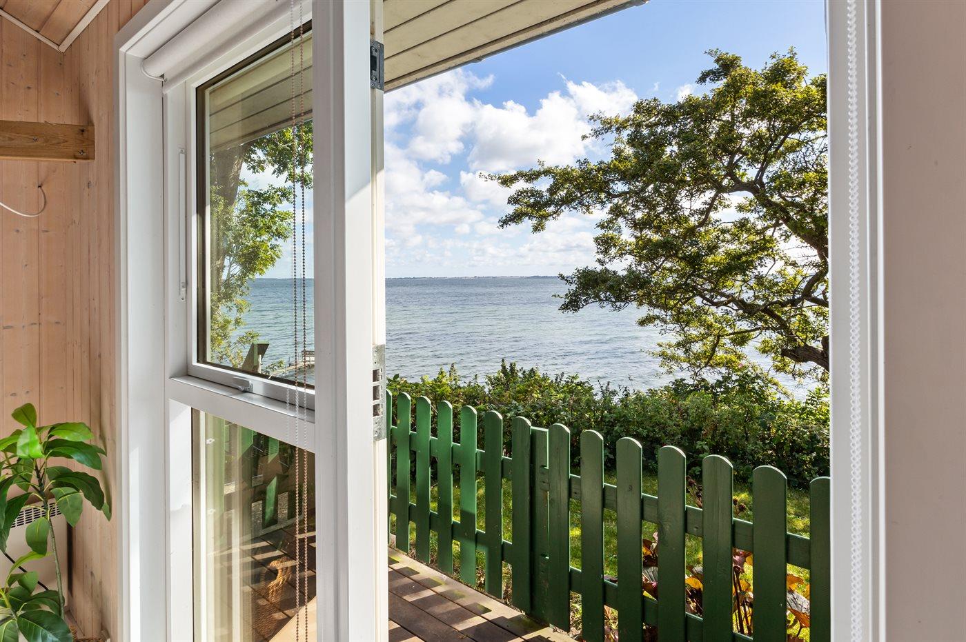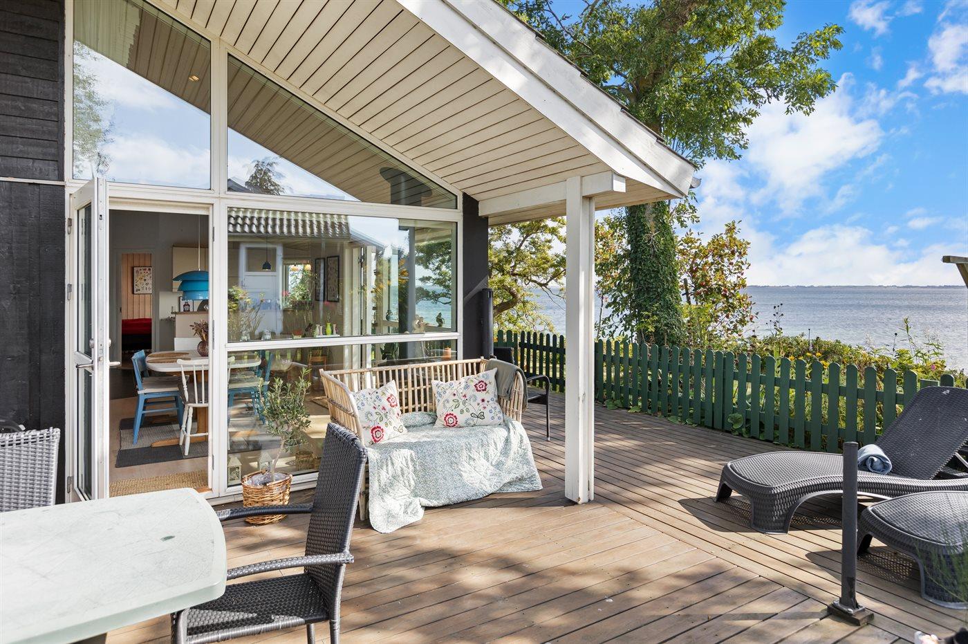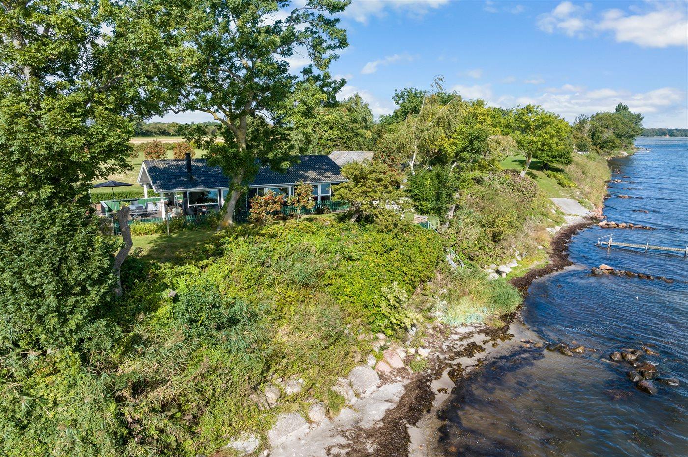 Fra både huset og terrasserne, som ligger højt, er der udsigt helt til Langeland. Fra huset fører en trappe ned til en hyggelig terrasse ved vandet, og videre ad en trappe er der direkte adgang til stranden.