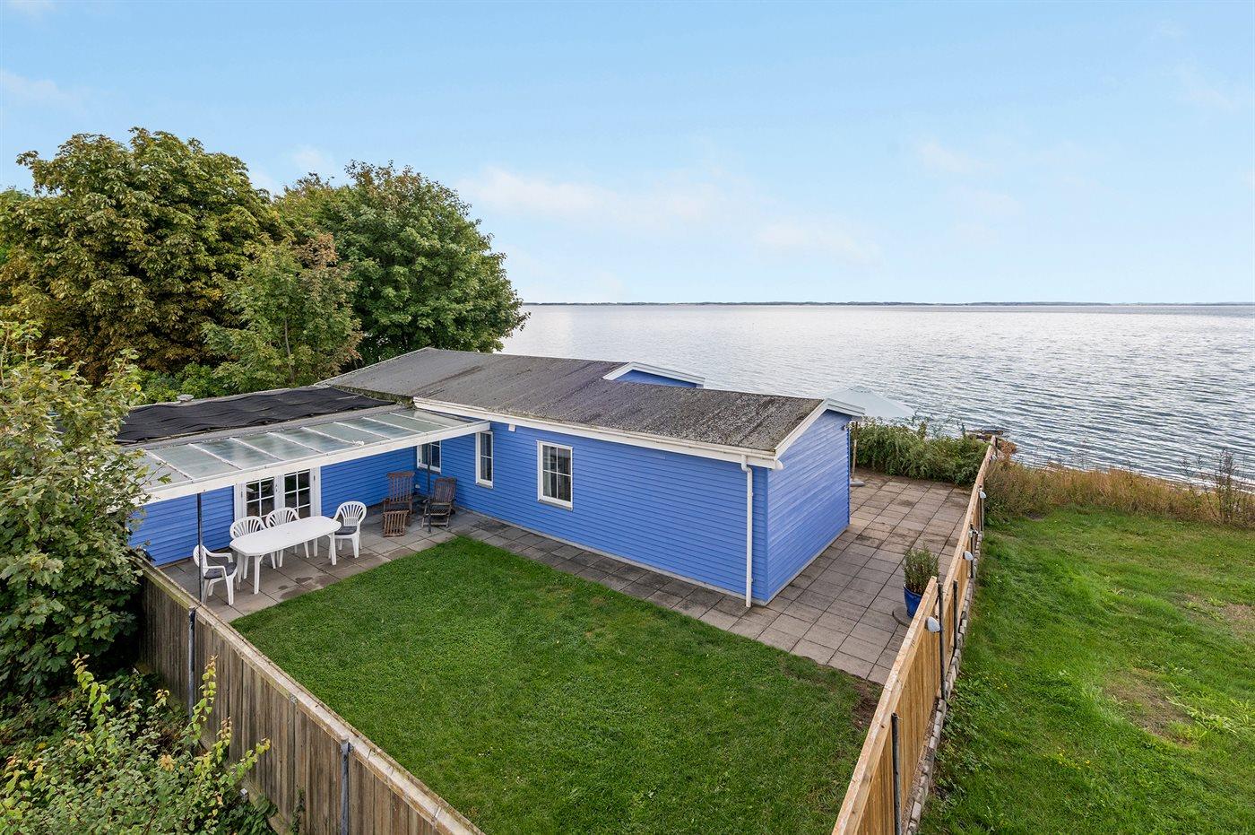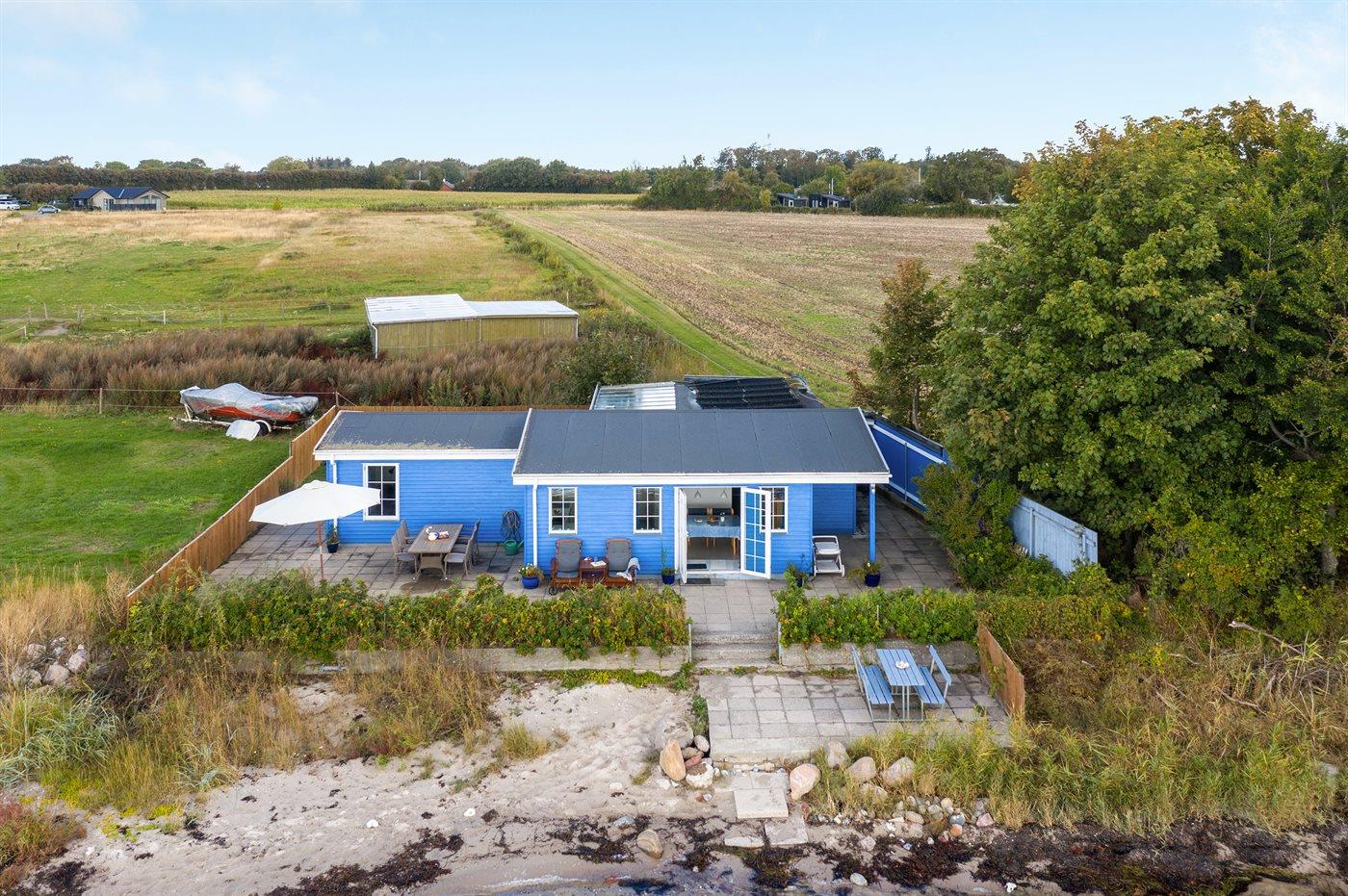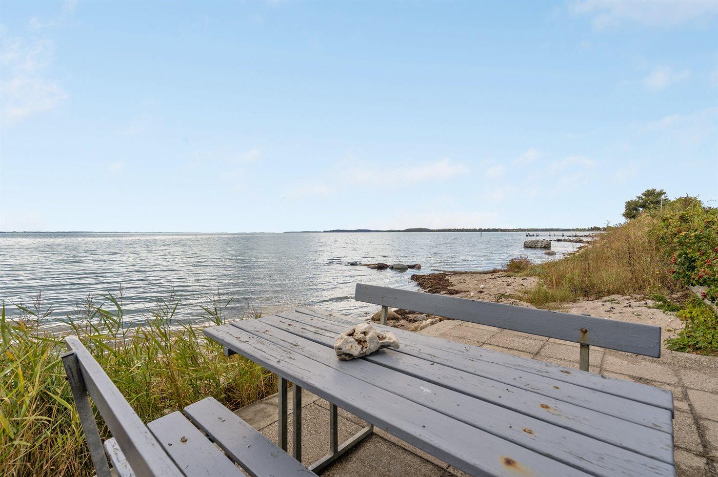 Fra det skønne ugenerte terrasseområde foran huset er der direkte adgang til stranden. Bag huset er der have og overdækket terrasse, og grunden omkring huset er lukket, så hunde og små børn kan færdes frit. Ved siden af huset, ud til vandet, er der et fælles grønt område, som frit kan benyttes.