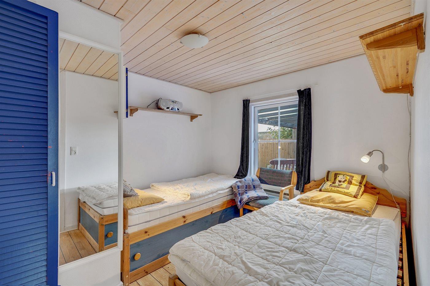 Der er i alt 3 soveværelser. Sovepladserne fordeler sig på: 4 sovepladser i dobbeltsenge. 2 sovepladser i enkeltsenge. Derudover er der 1 stk. barneseng.