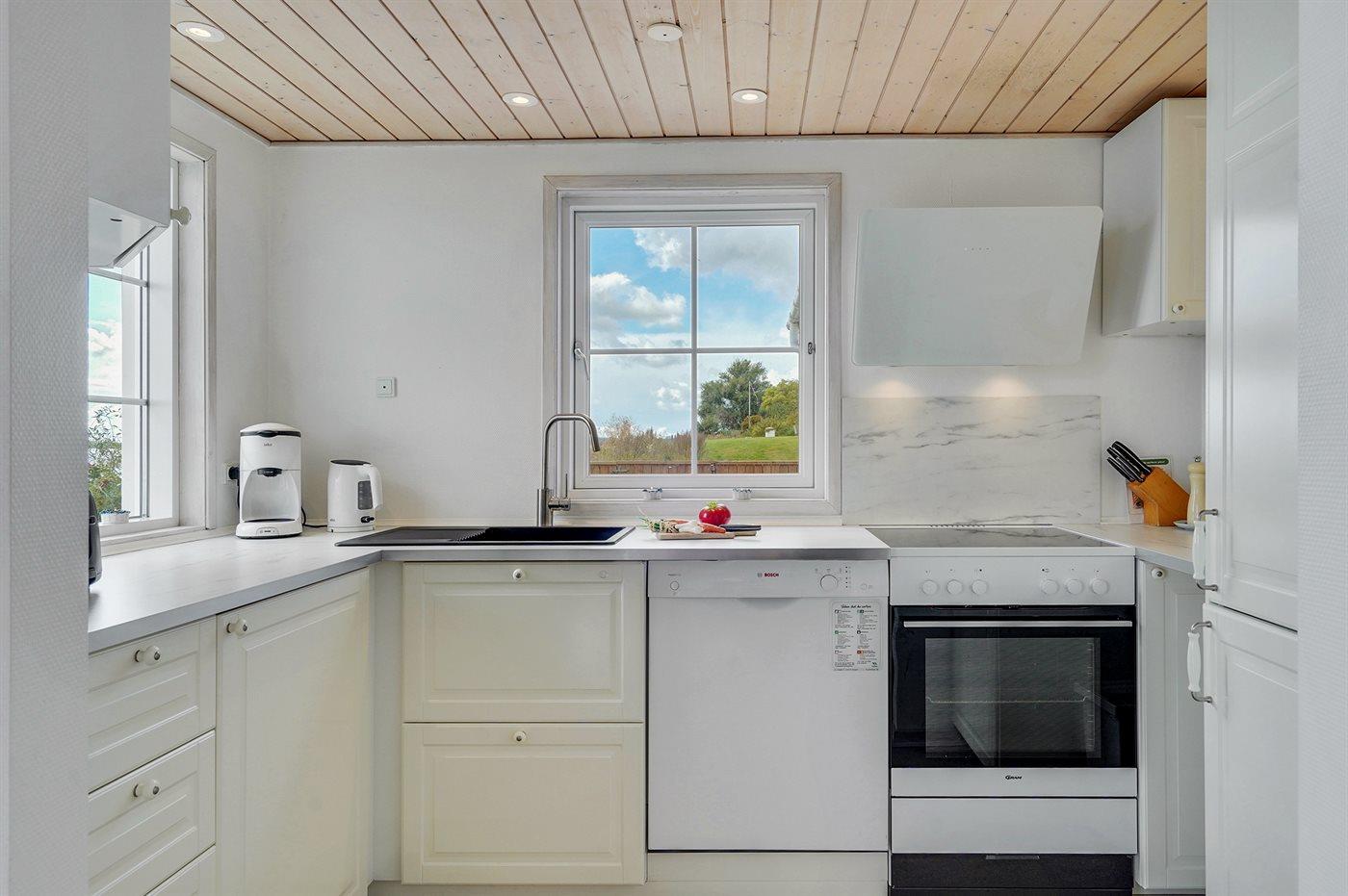 Køkkenet er udstyret med 1 køleskab. Der er 4 keramiske kogeplader, varmluftovn, mikrobølgeovn samt opvaskemaskine.