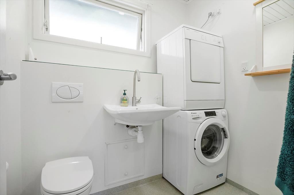Badeværelse med toilet, håndvask og bruser. Vaskemaskine og tørretumbler.