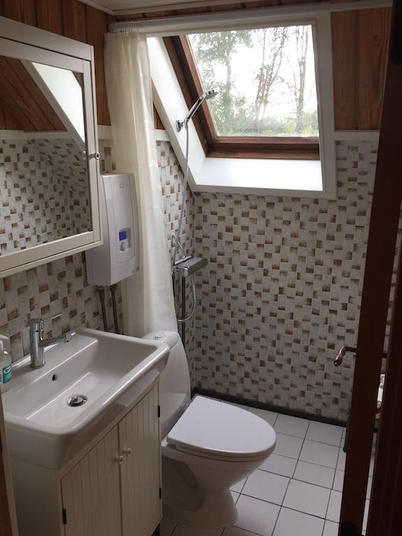 Badeværelset har brusebad og toilet.