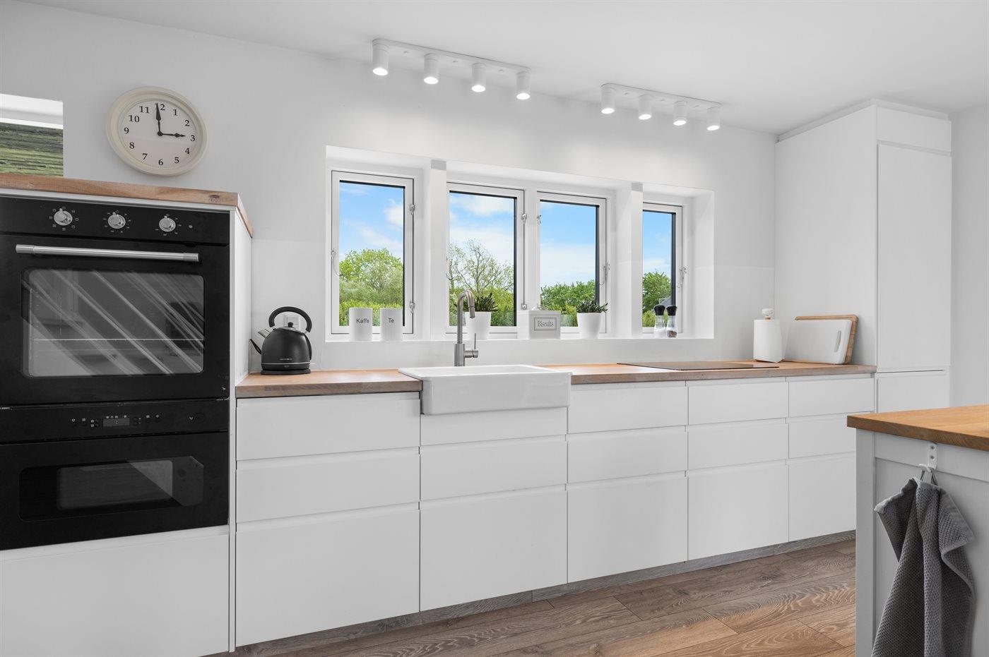 Køkkenet er udstyret med 1 køleskab. Der er 4 induktionskogeplader, varmluftovn, mikrobølgeovn samt opvaskemaskine Der er gulvvarme i køkkenet.