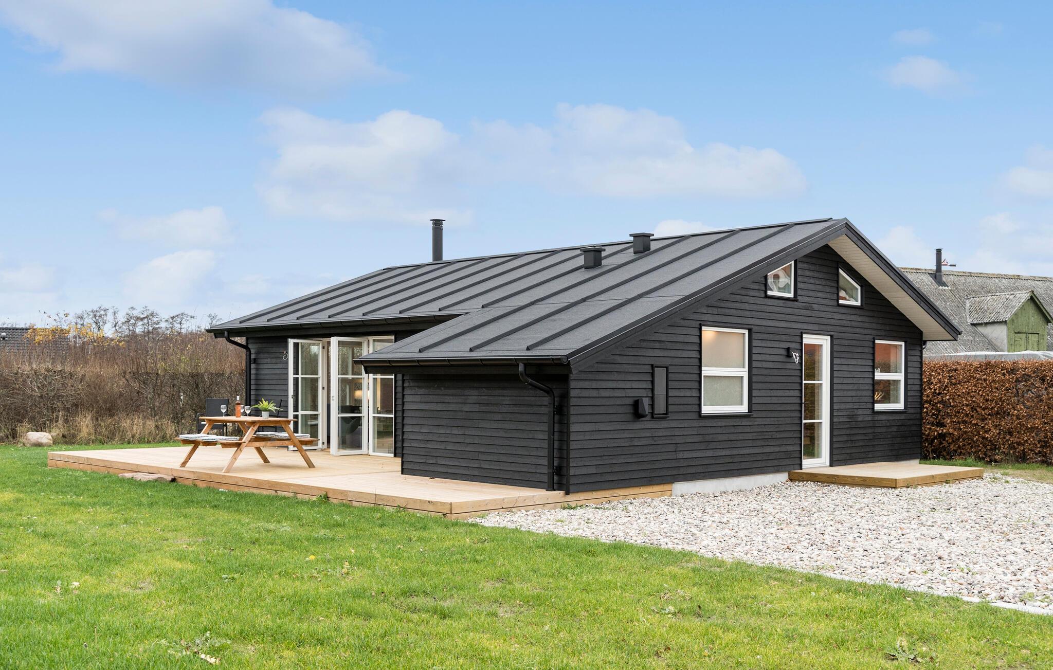 Moderne sommerhus i Tårup Strand med stor træterrasse og nærhed til strand og natur.