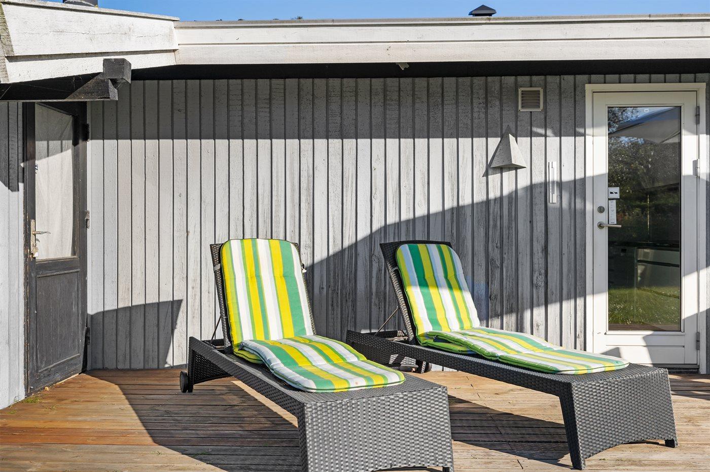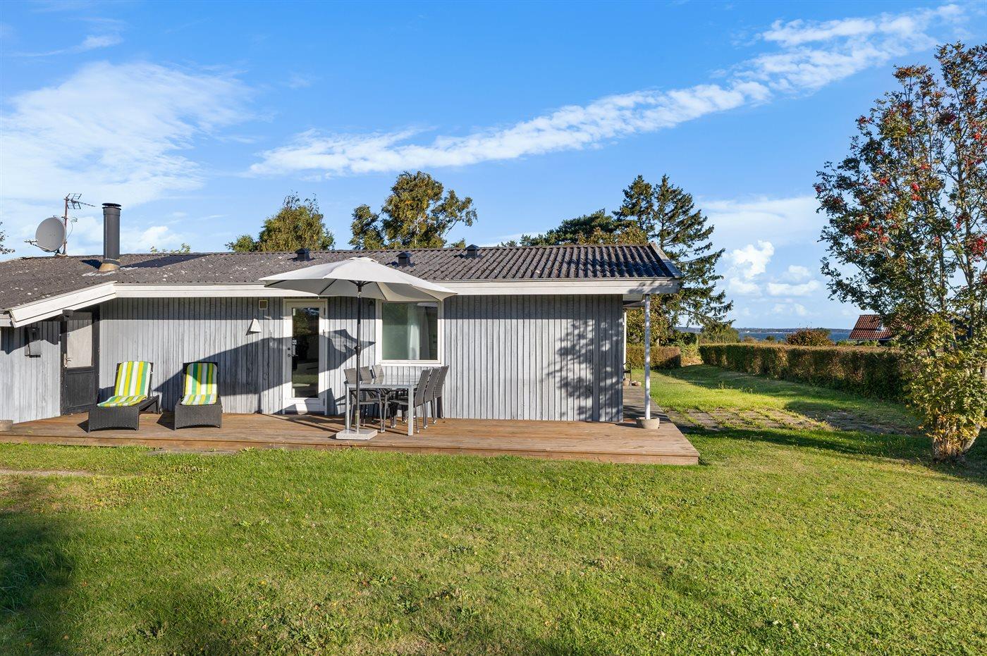 Hyggeligt sommerhus på Tåsinge med flere terrasser, nær strand og badebro i sommerperioden.