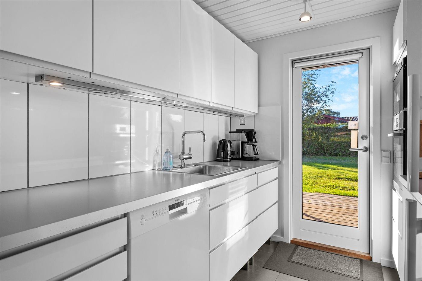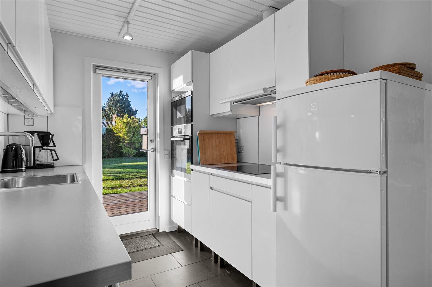 Køkkenet er udstyret med 1 køleskab. Der er 4 induktionskogeplader, varmluftovn, mikrobølgeovn samt opvaskemaskine Der er gulvvarme i køkkenet.