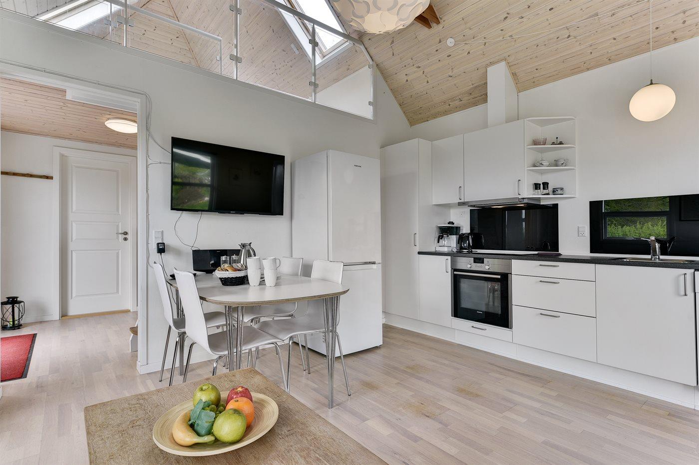 Køkkenet er udstyret med 1 køleskab. Der er 3 keramiske kogeplader. Der er 1 induktionskogeplader, varmluftovn samt opvaskemaskine.