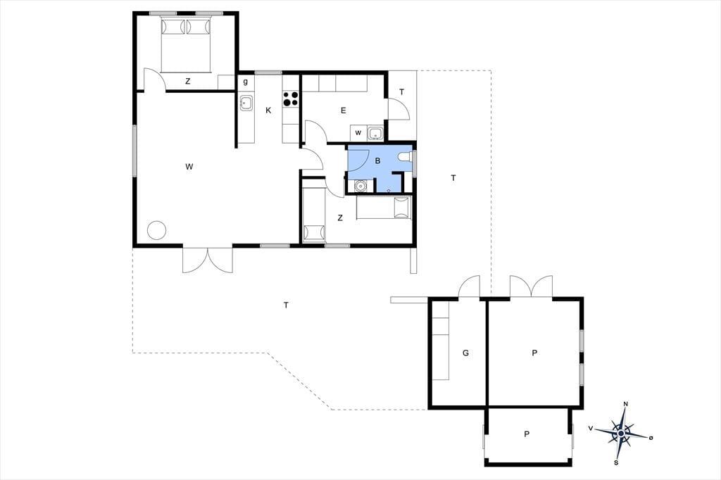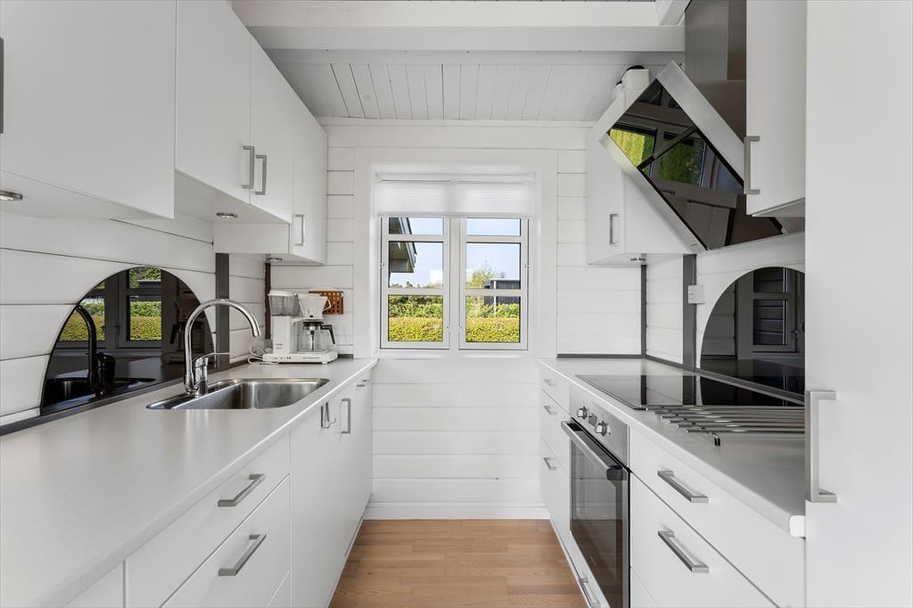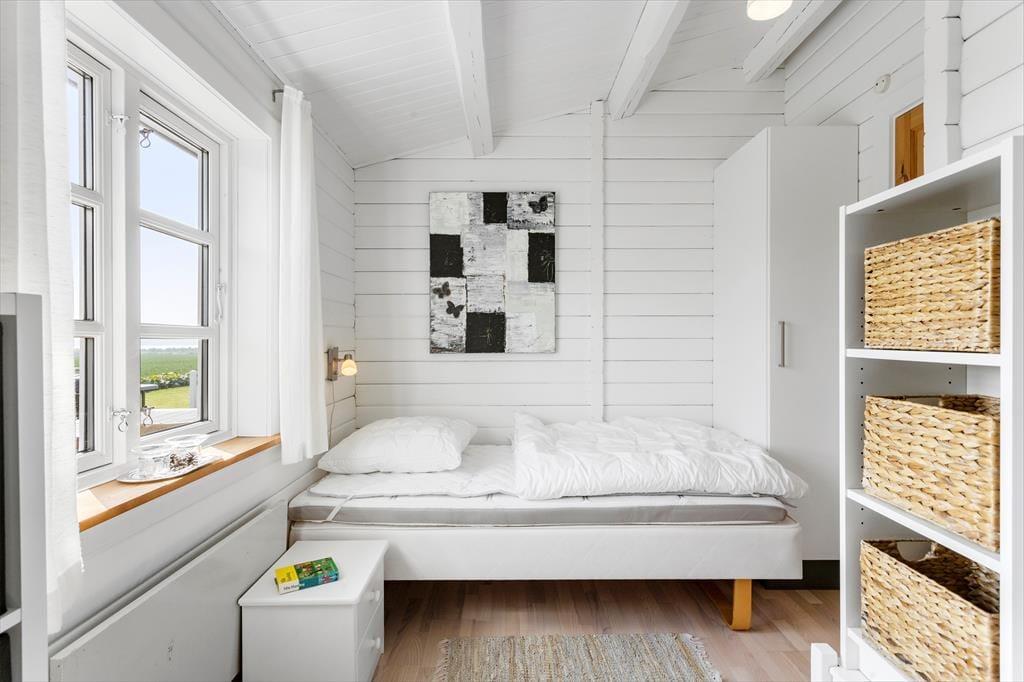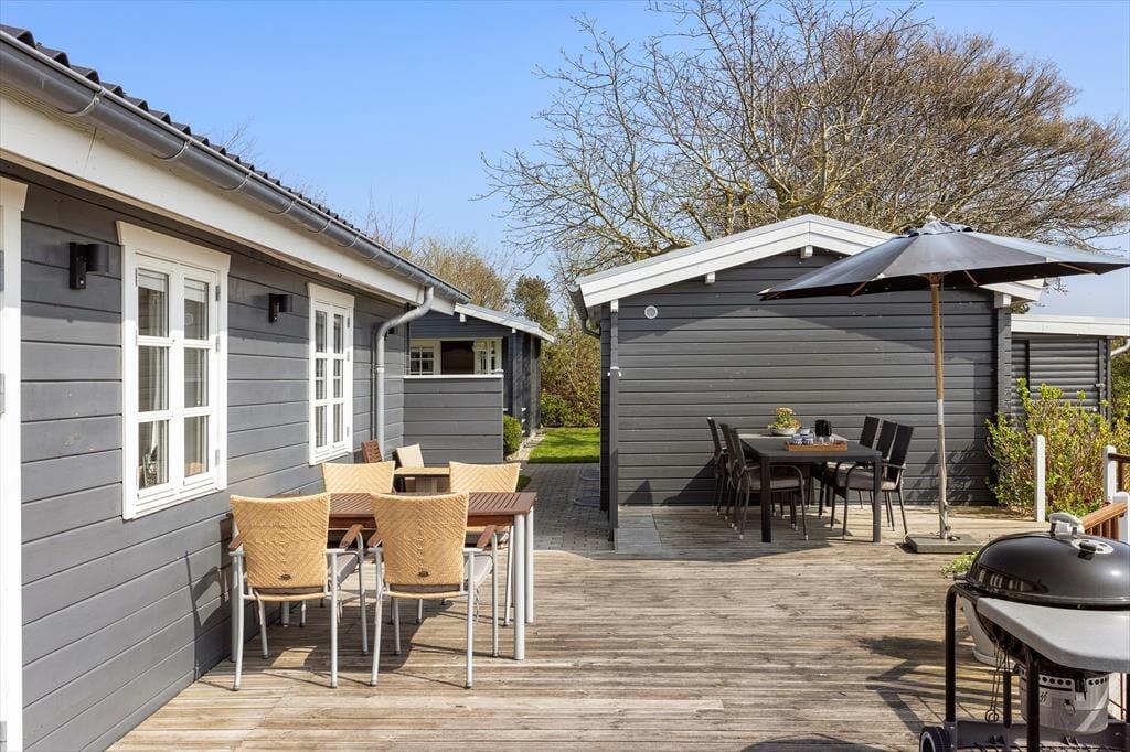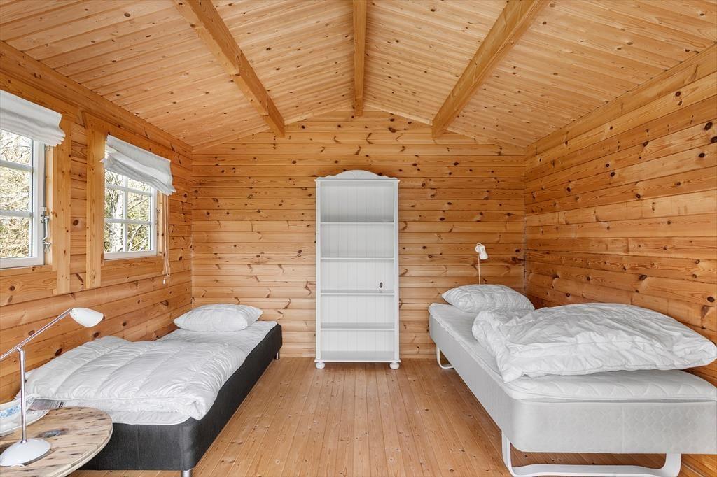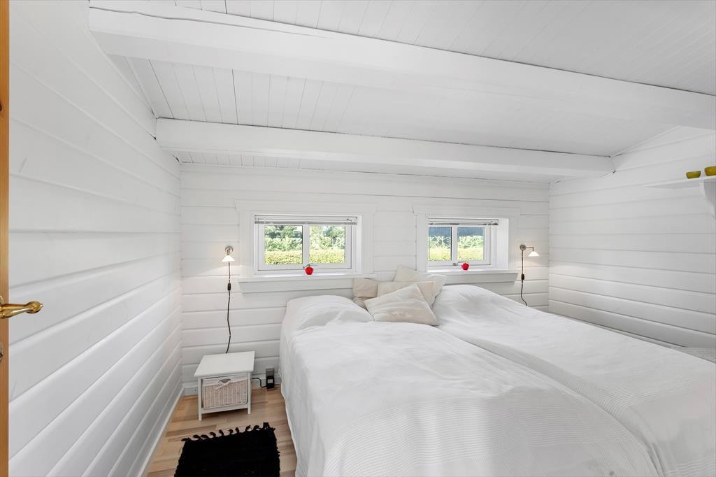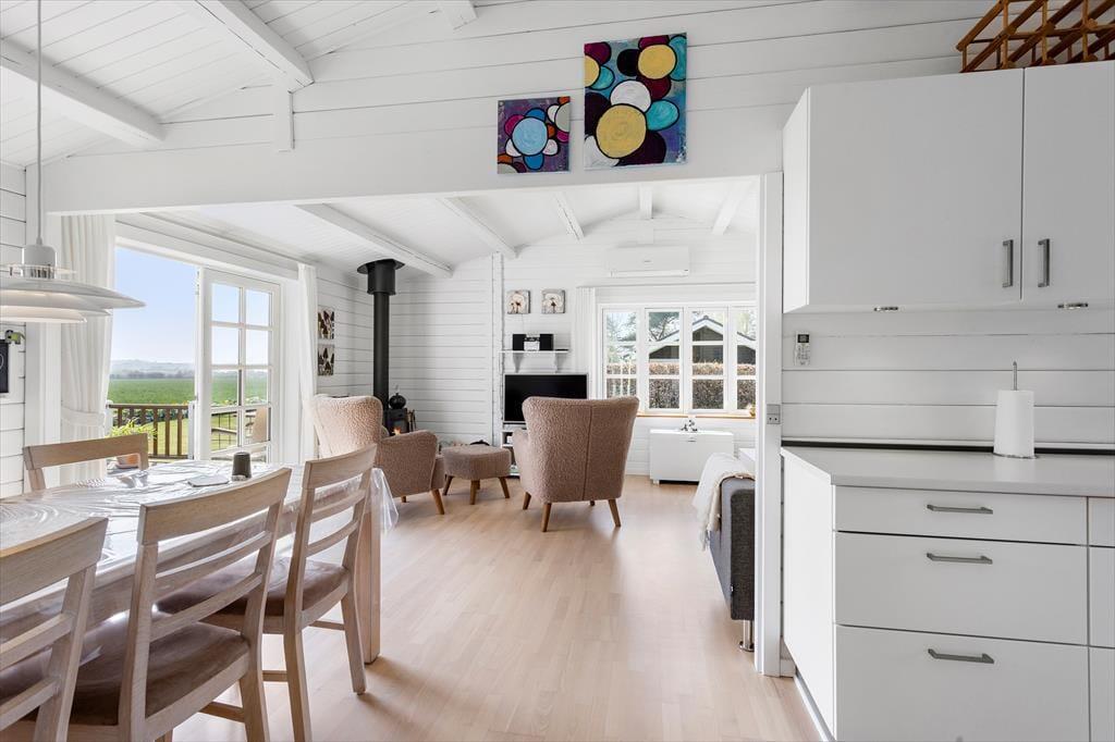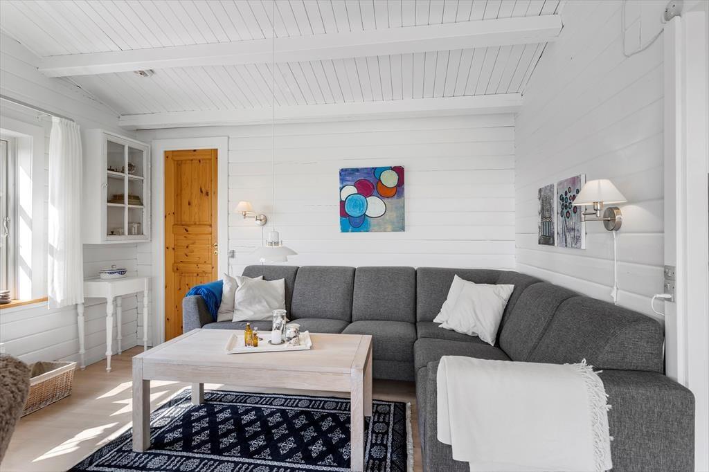 Indenfor i sommerhuset bliver du mødt af en varm og lys atmosfære, der straks skaber ro og feriestemning. Den hyggelige stue med brændeovn danner et naturligt samlingspunkt for familien, hvor I kan nyde hinandens selskab, spille brætspil eller slappe af efter en dag i det fri. Det åbne køkken ligger i direkte forbindelse med spisestuen og giver mulighed for at lave mad sammen, mens snakken flyder frit. Fra spisestuen er der udgang til den store terrasse, hvilket skaber en naturlig overgang mellem inde og ude. Huset har to fine soveværelser, begge enkelt og komfortabelt indrettede med alt, hvad I behøver for en god nats søvn. Derudover finder I et dejligt anneks med to ekstra sovepladser – perfekt til teenagere eller gæster, der ønsker lidt mere privatliv. Badeværelset er lyst og funktionelt med bruser og moderne faciliteter, så I nemt kan starte dagen friske og klar til nye oplevelser.