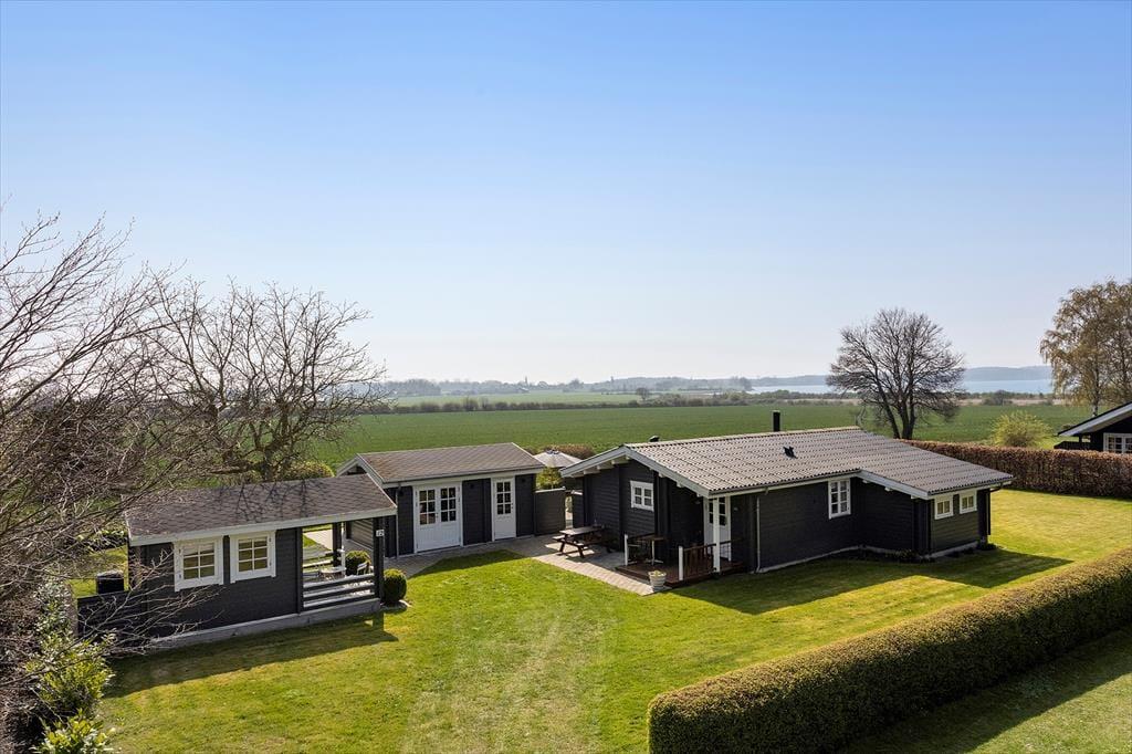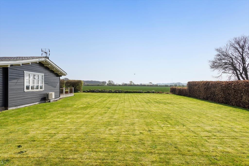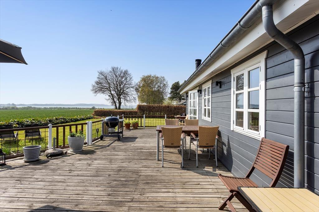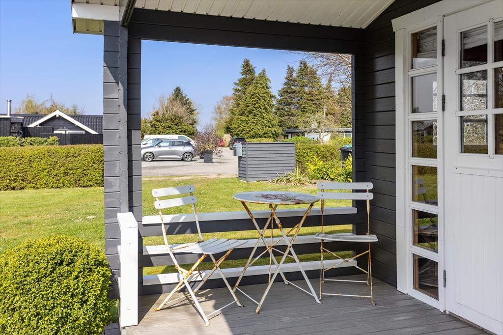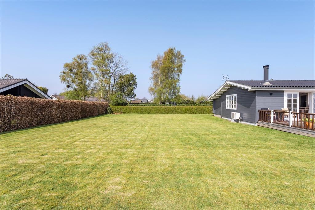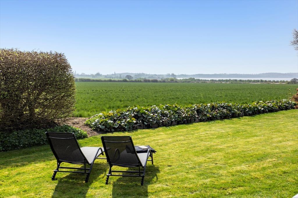 Det udendørs område ved sommerhuset inviterer til lange dage i solen og hyggelige stunder under åben himmel. Den store terrasse er husets hjerte i sommerhalvåret, hvor I kan nyde morgenmaden med udsigt til Lunkebugten eller afslutte dagen med et glas vin, mens solen går ned over vandet. Med både sol og skygge kan terrassen bruges fra morgen til aften, og den skønne udsigt til bugten giver en helt særlig ro. Haven omkring huset er åben og velplejet, så børnene har god plads til at lege, mens de voksne nyder roen og måske en god bog i liggestolen. Der er desuden kort vej til stranden, som er både lavvandet og børnevenlig – ideel til sandkager, sopning og afslappet strandliv for hele familien. Og efter en tur i vandet kan I skylle sandet af fødderne og nyde en kold forfriskning på terrassen.