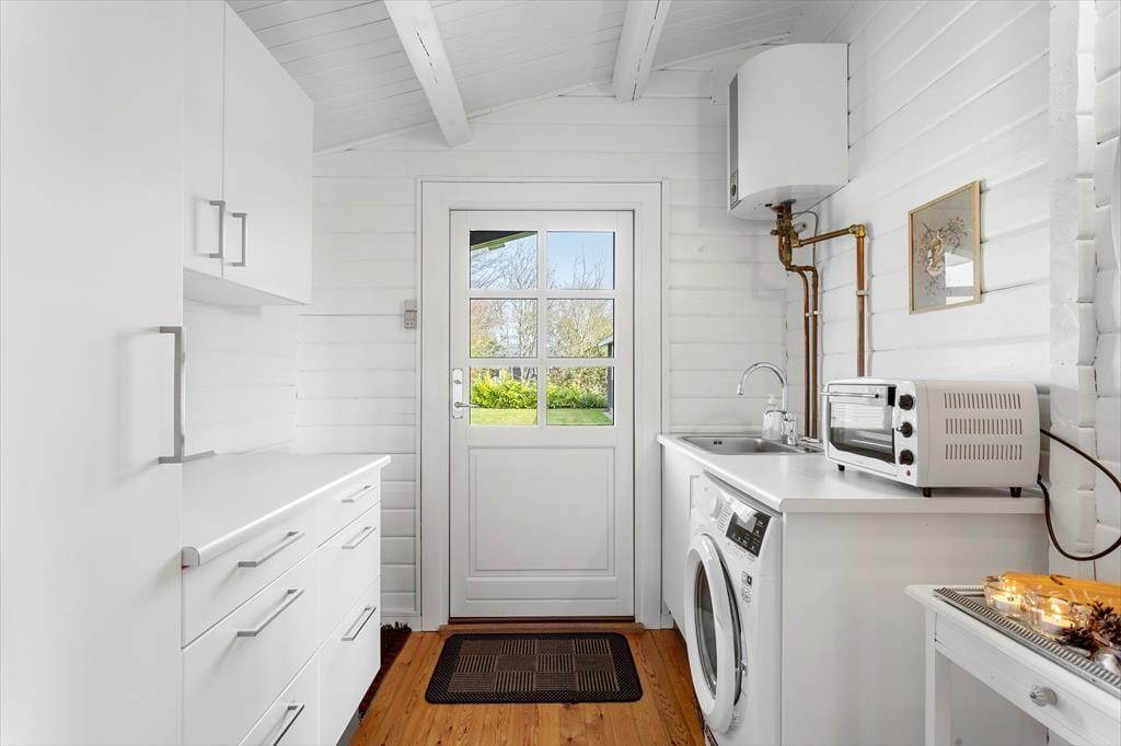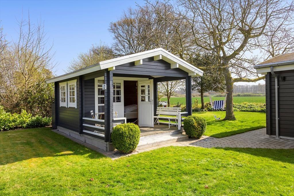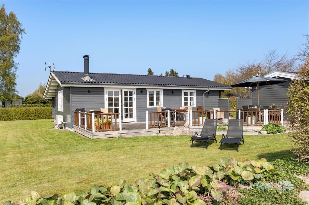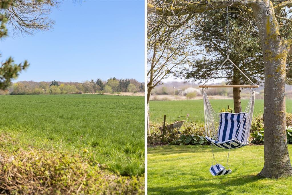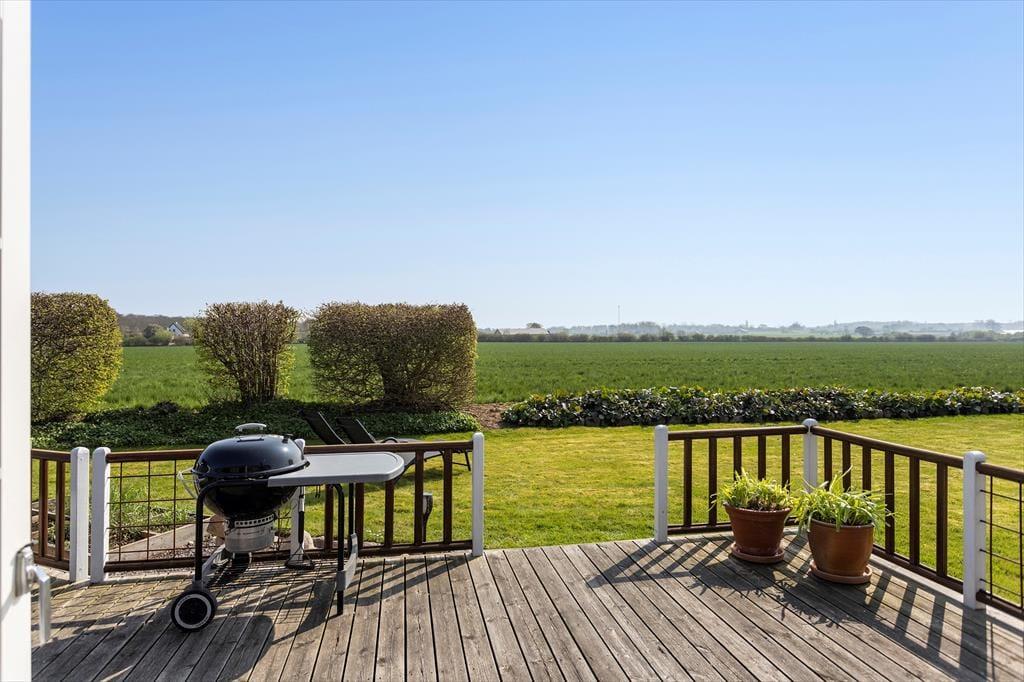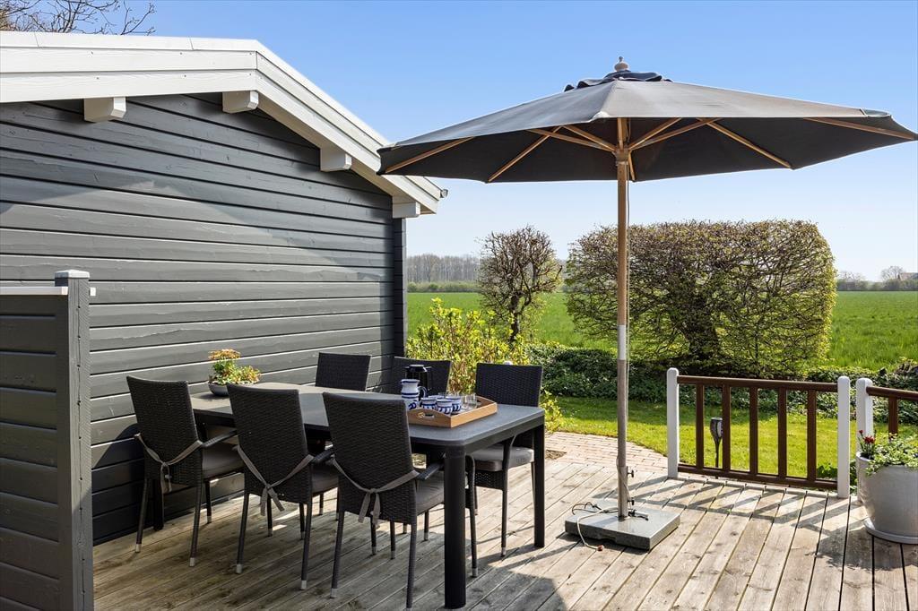 Det udendørs område ved sommerhuset inviterer til lange dage i solen og hyggelige stunder under åben himmel. Den store terrasse er husets hjerte i sommerhalvåret, hvor I kan nyde morgenmaden med udsigt til Lunkebugten eller afslutte dagen med et glas vin, mens solen går ned over vandet. Med både sol og skygge kan terrassen bruges fra morgen til aften, og den skønne udsigt til bugten giver en helt særlig ro. Haven omkring huset er åben og velplejet, så børnene har god plads til at lege, mens de voksne nyder roen og måske en god bog i liggestolen. Der er desuden kort vej til stranden, som er både lavvandet og børnevenlig – ideel til sandkager, sopning og afslappet strandliv for hele familien. Og efter en tur i vandet kan I skylle sandet af fødderne og nyde en kold forfriskning på terrassen.