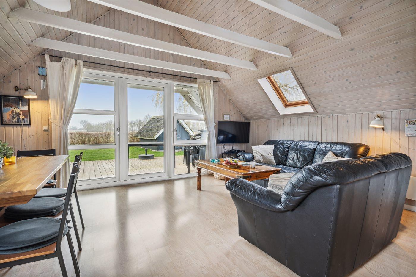 Bag huset findes der en skøn, delvist overdækket og sydvendt terrasse, hvorfra der er udsigt til åbne marker og skov.