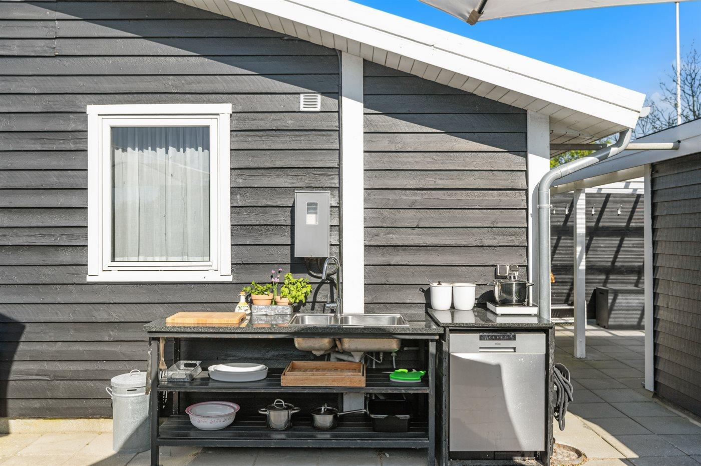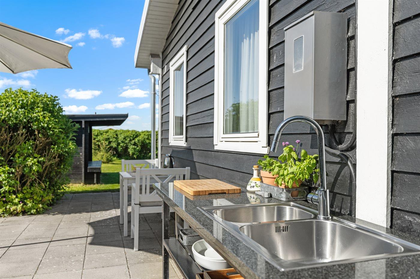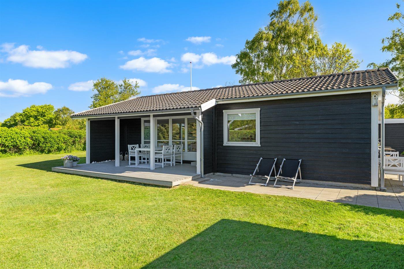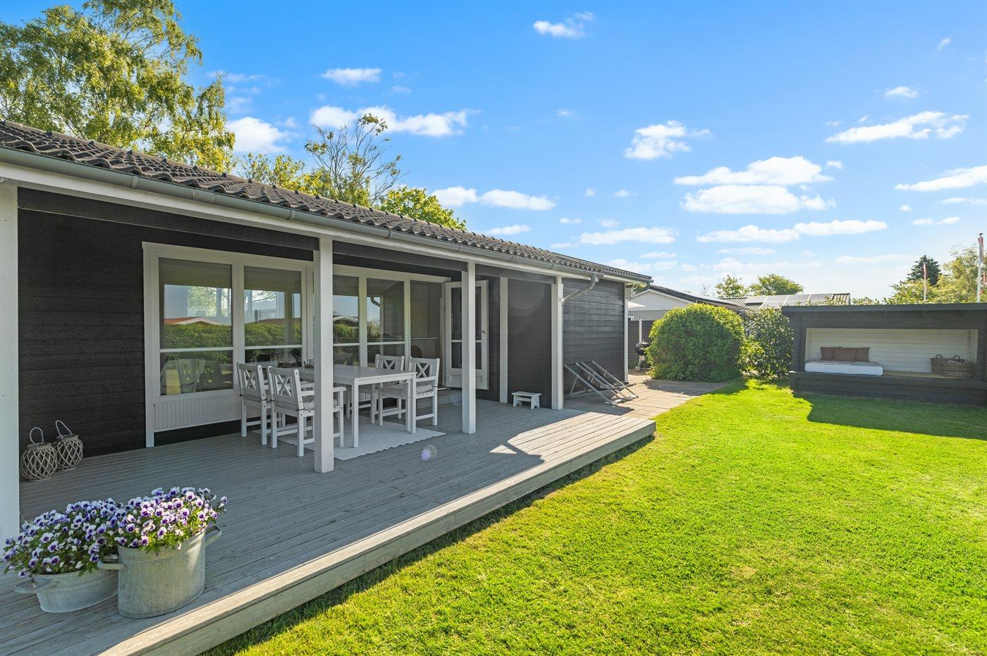 Charmerende sommerhus nær badestrand med stort terrasseområde og moderne faciliteter.