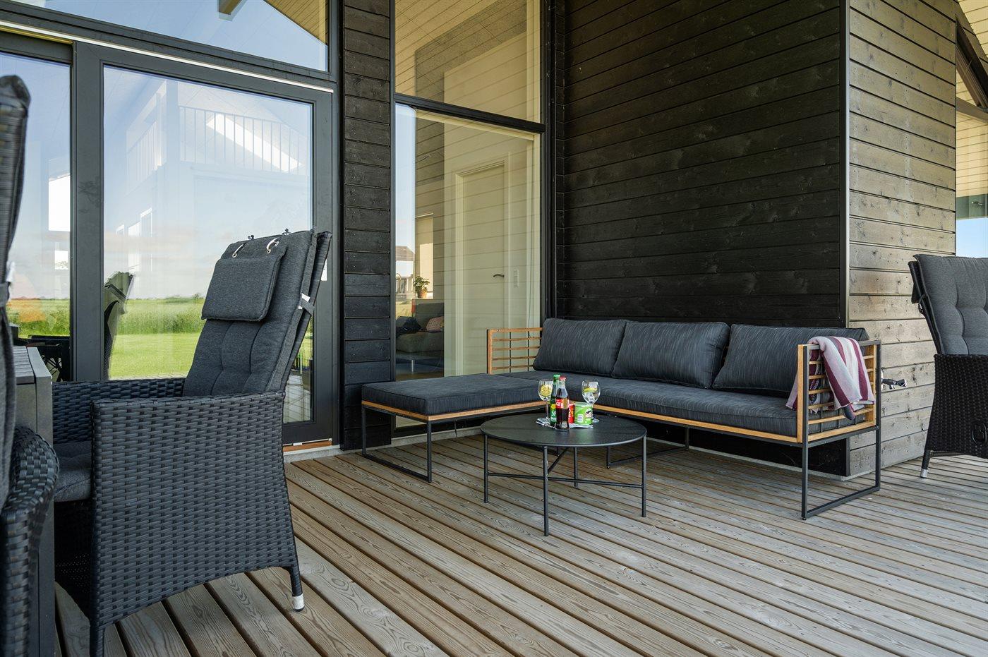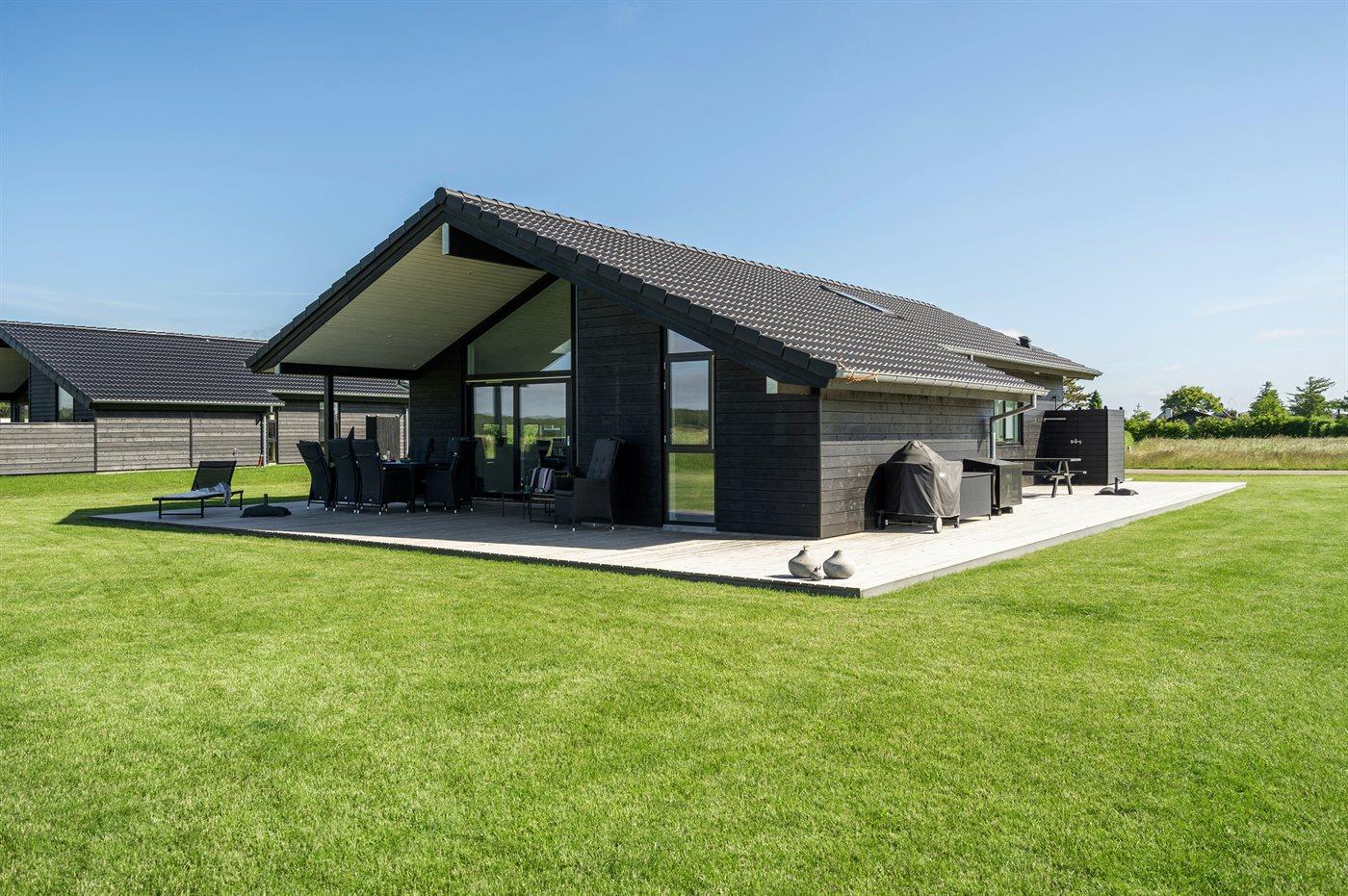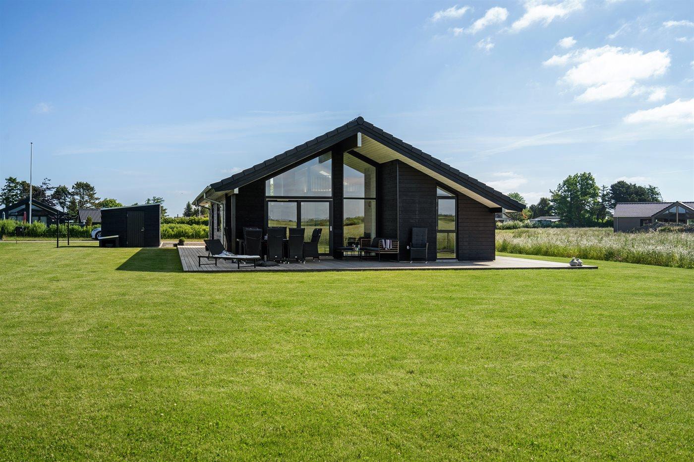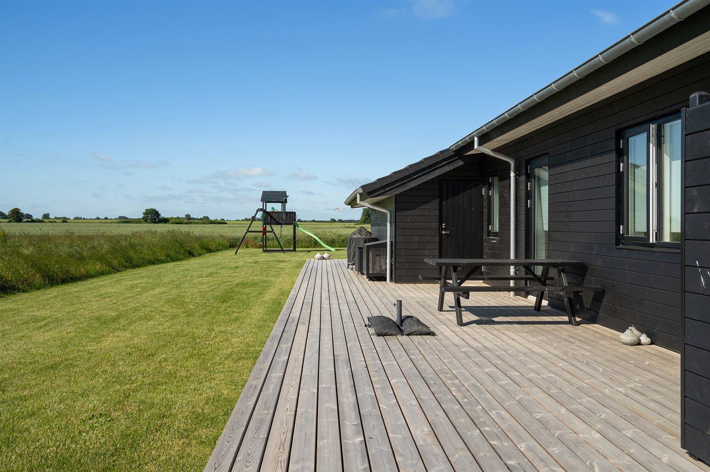 Lys og nybygget sommerhus nær børnevenlig badestrand med stor terrasse og moderne faciliteter.