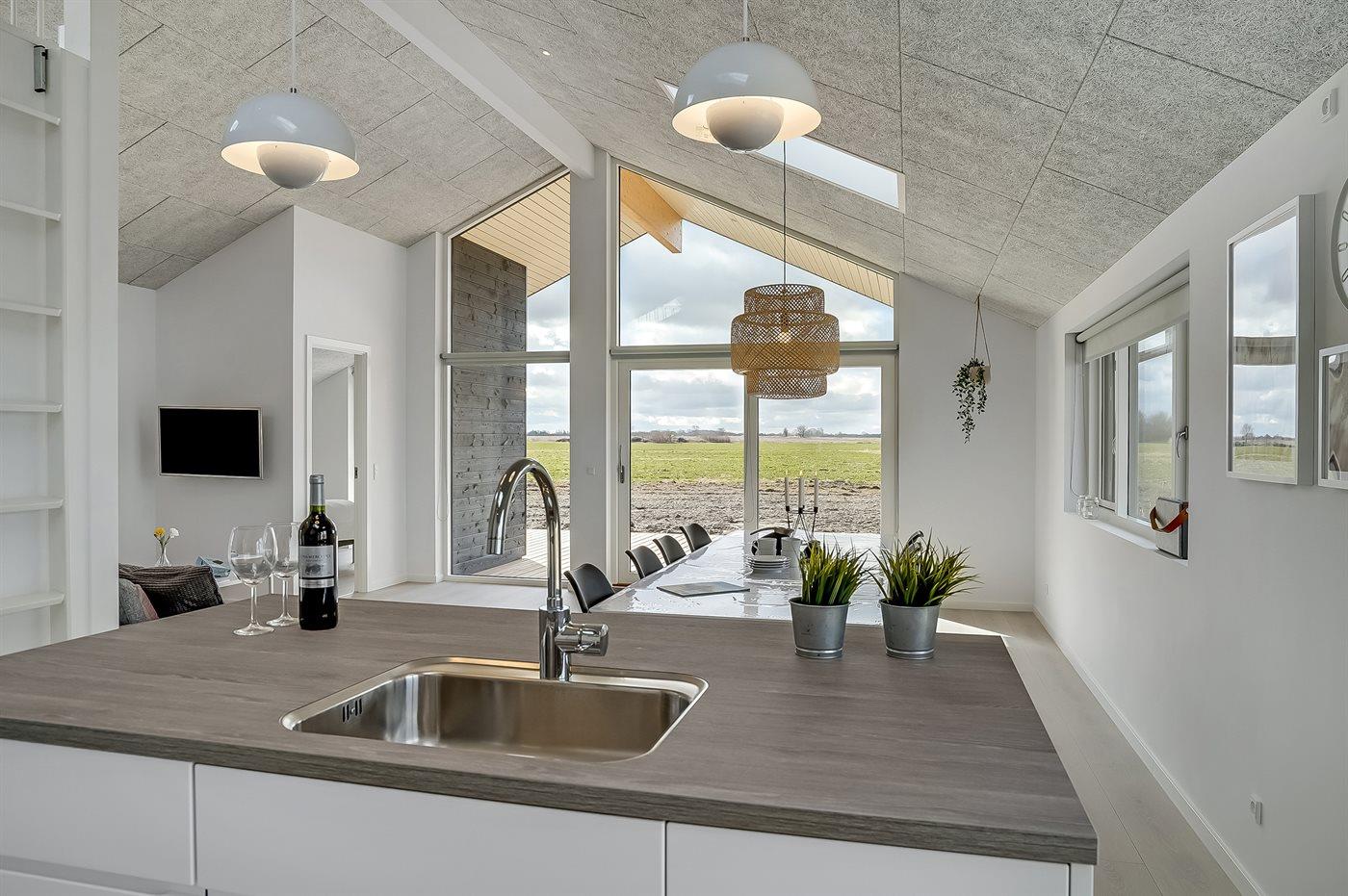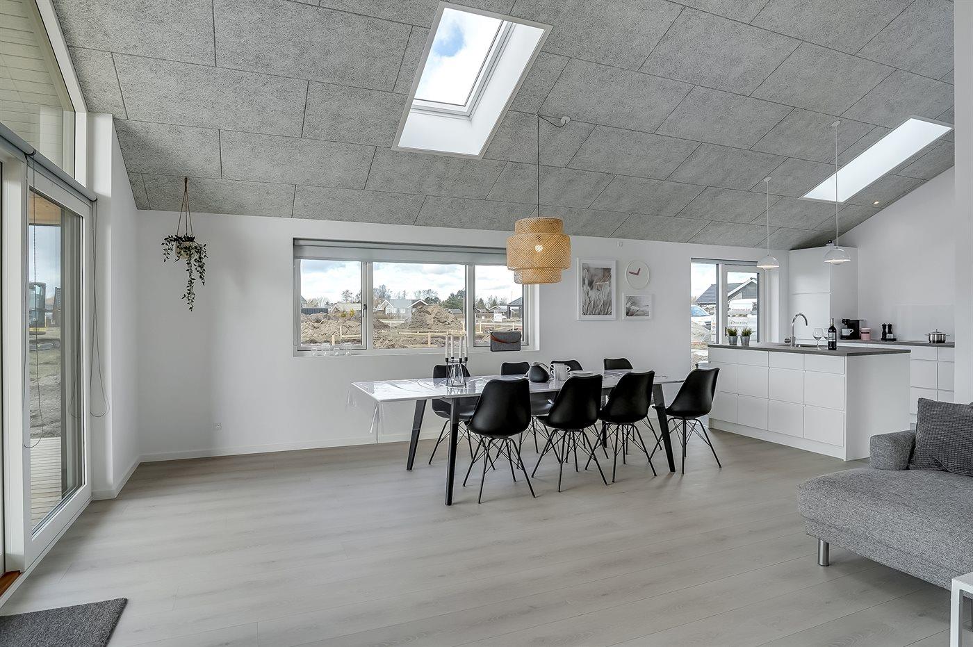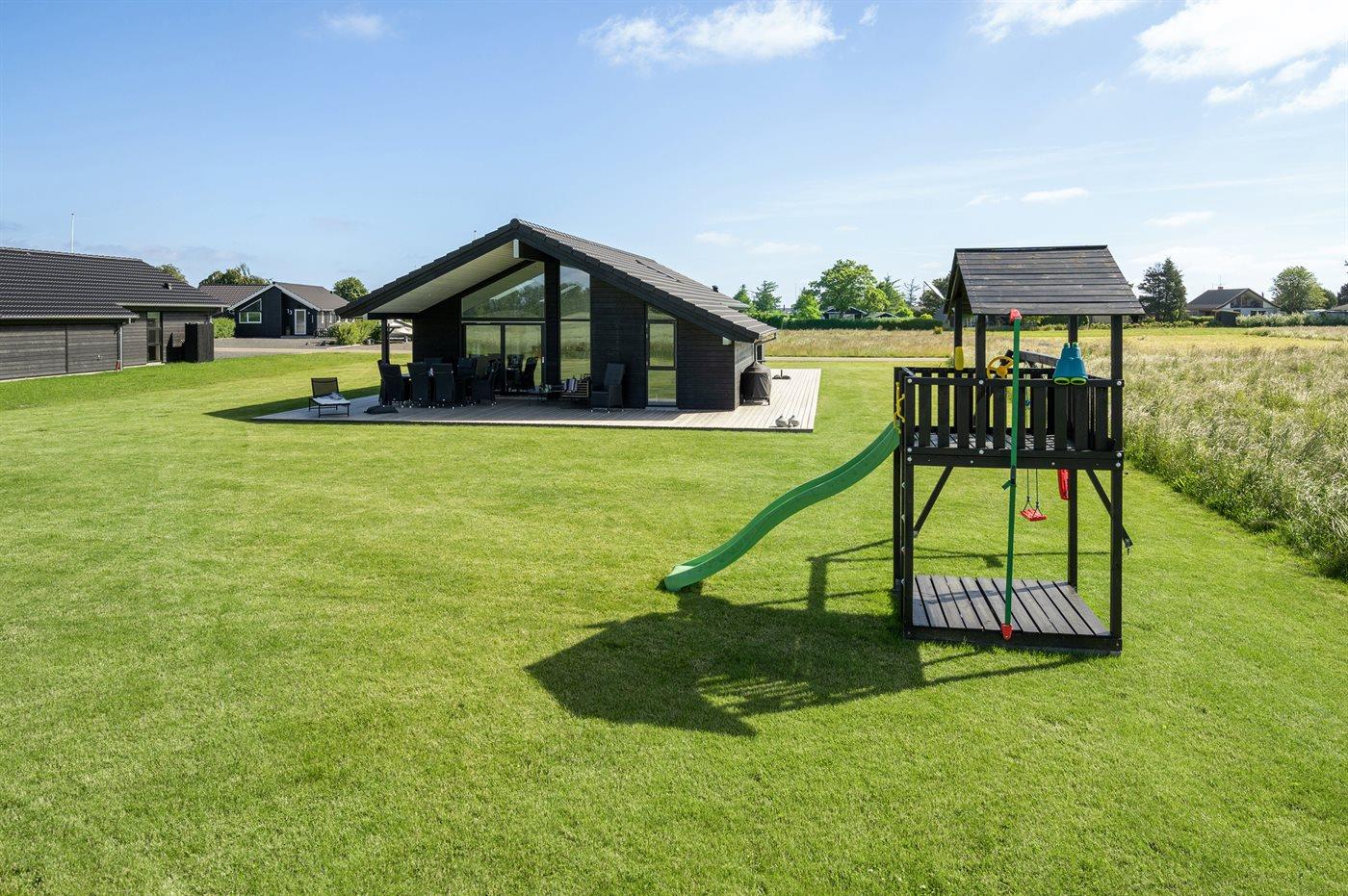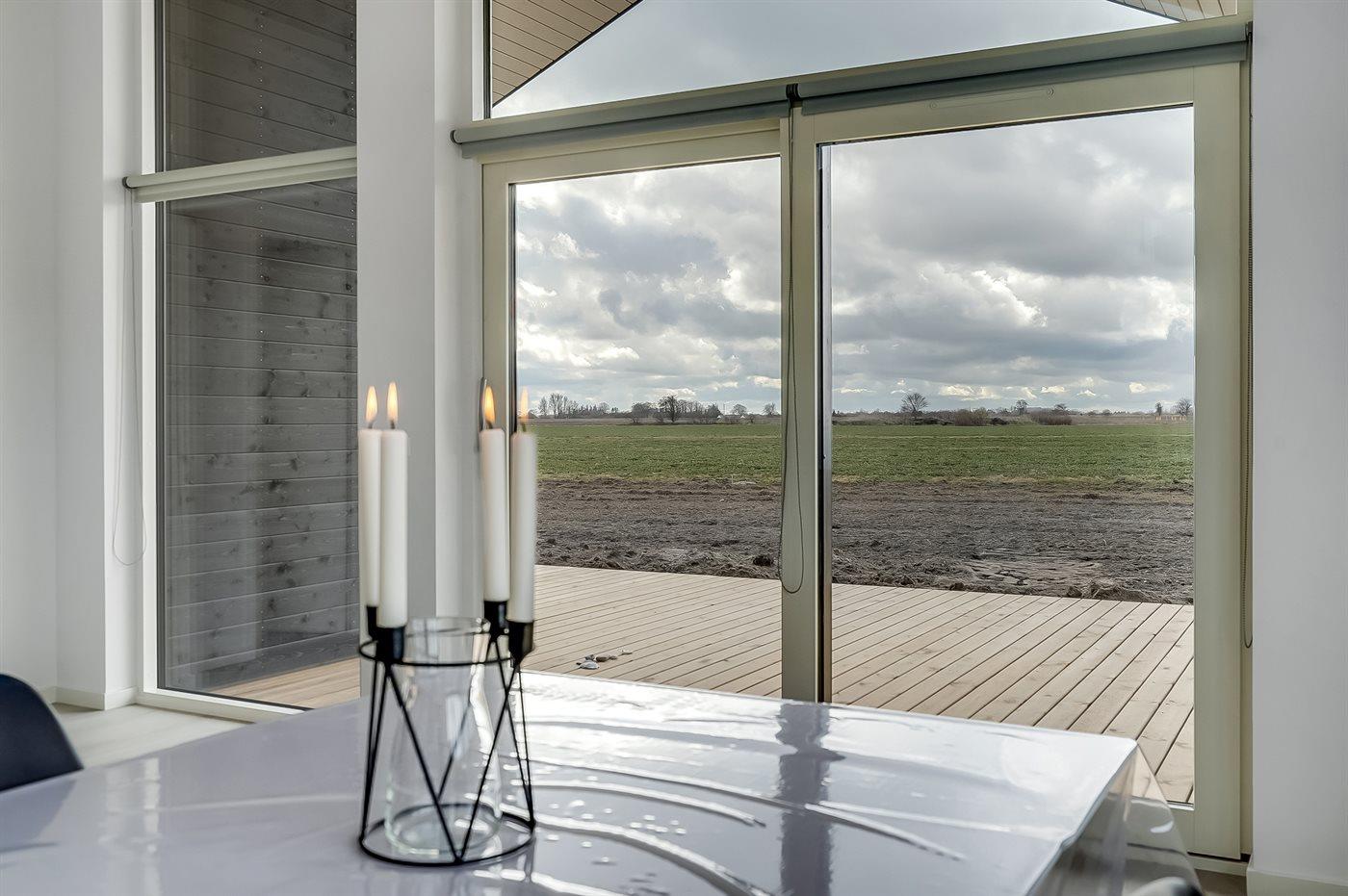 Lys og nybygget sommerhus nær børnevenlig badestrand med stor terrasse og moderne faciliteter.