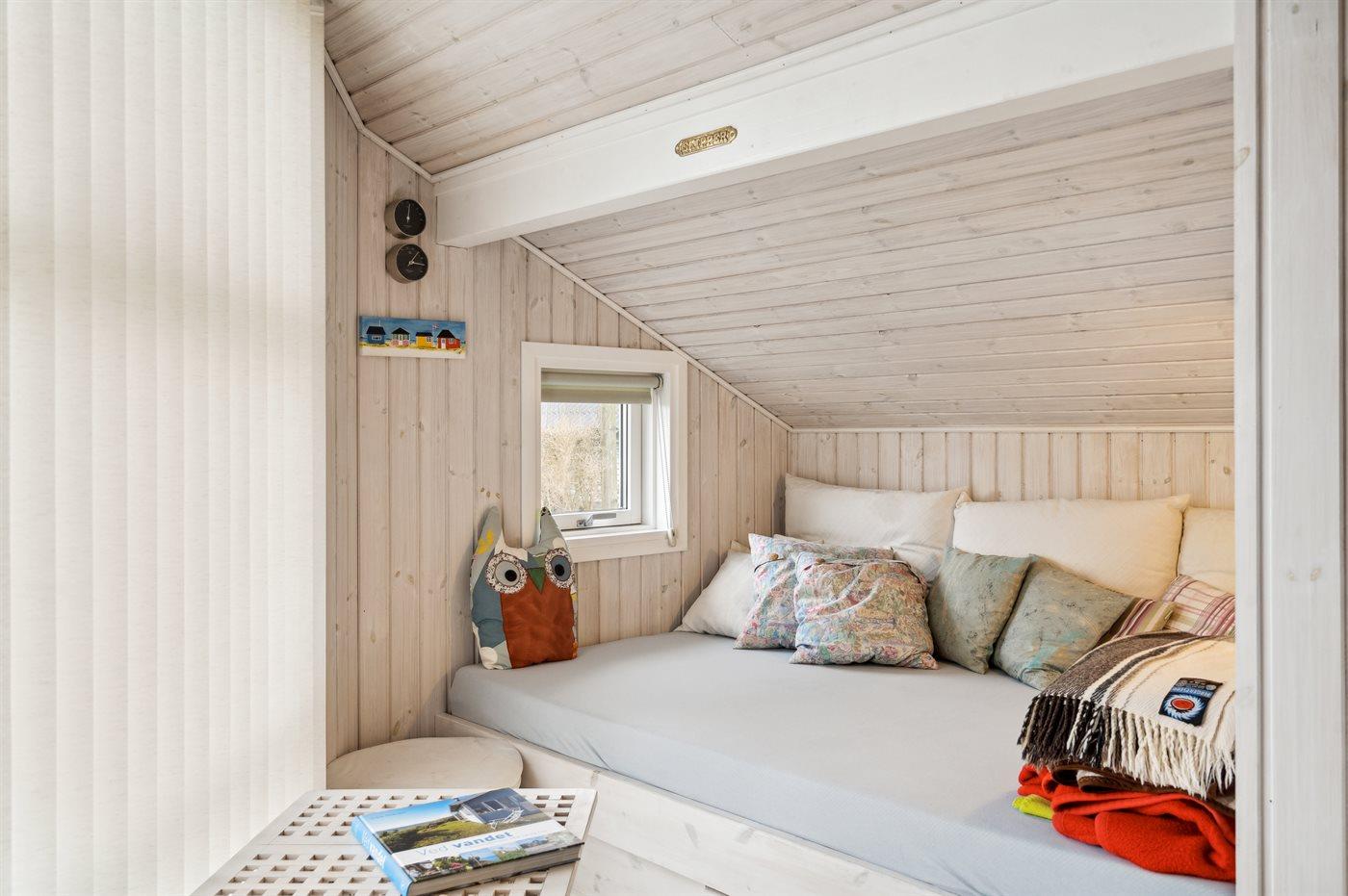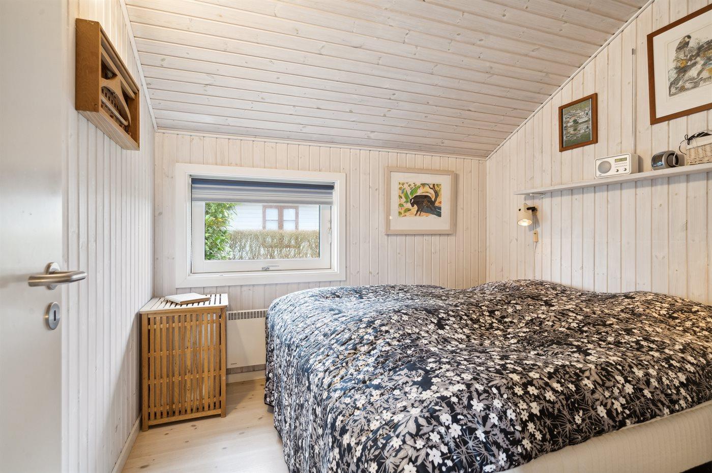 Der er i alt 2 soveværelser. Sovepladserne fordeler sig på: 2 sovepladser i dobbeltseng. 2 sovepladser i enkeltsenge. 2 sovepladser i alkove. 2 af disse sovepladser befinder sig i stuen. Derudover er der 1 stk. barneseng.