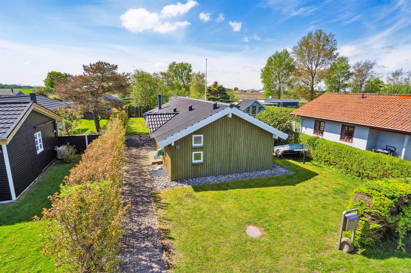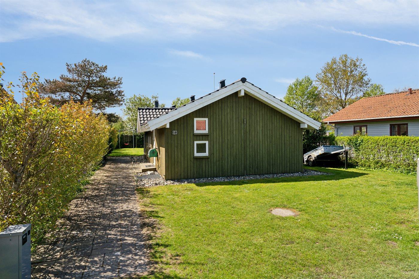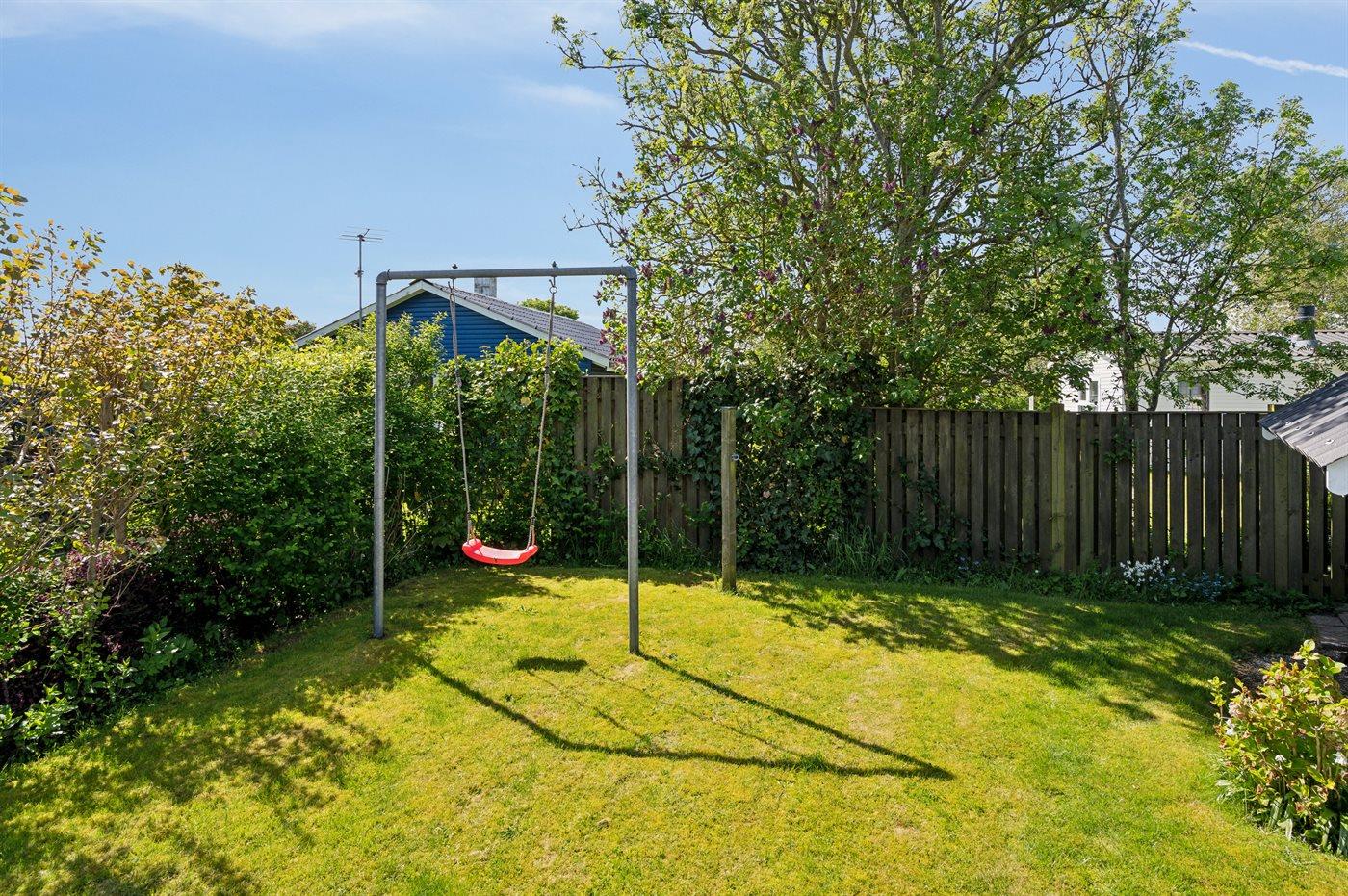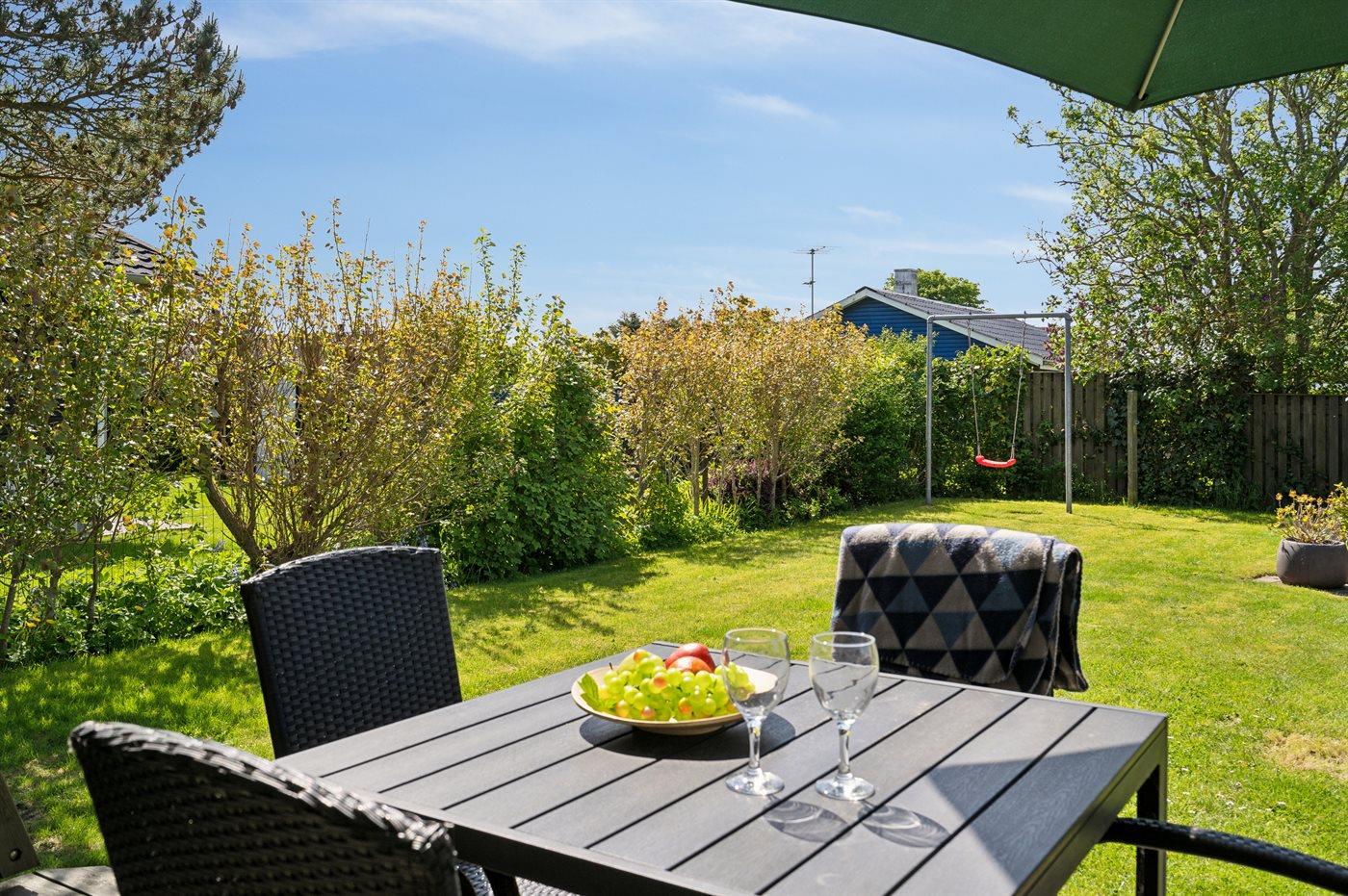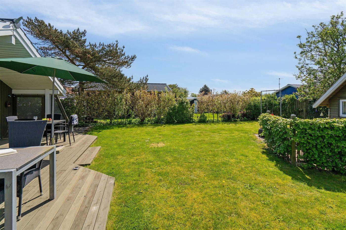 Ferieboligen er beliggende på en 410 m² stor havegrund. Der er 100 m til havet. Nærmeste forretning er beliggende i en afstand af 2500 m. Til ferieboligen hører åbent terrasseareal. Desuden er der overdækket terrasse. Gynge. Grill til rådighed. Parkering ved ferieboligen.