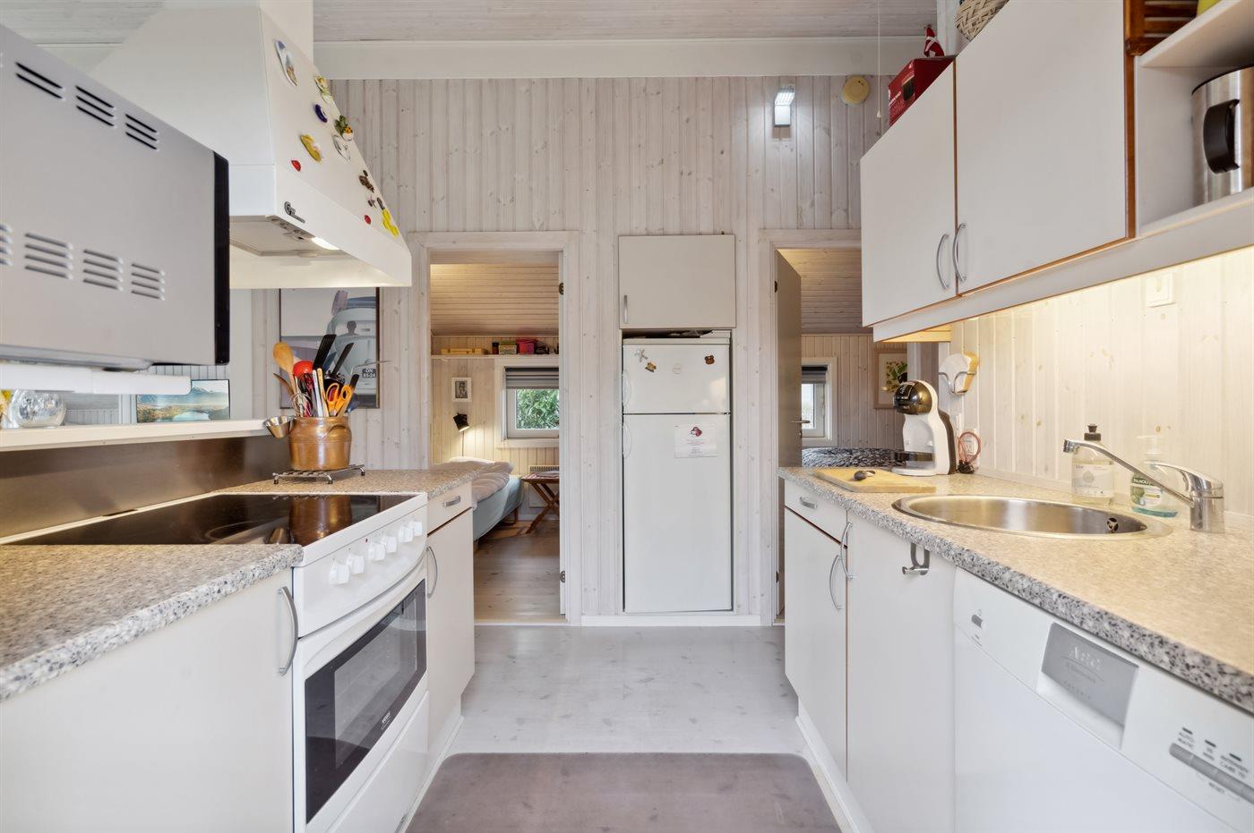 Køkkenet er udstyret med 1 køleskab. Der er 4 keramiske kogeplader, varmluftovn, mikrobølgeovn samt opvaskemaskine.