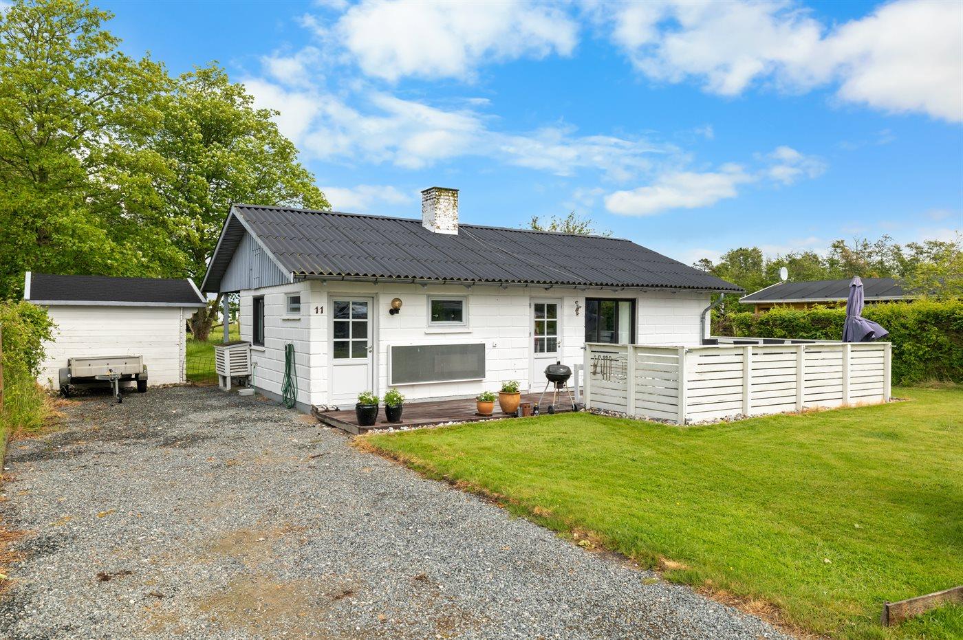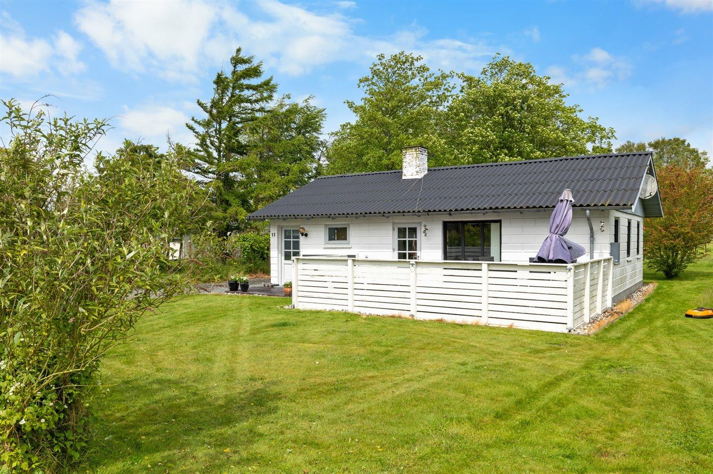 Hyggeligt sommerhus ved Tørresø med lukket terrasse, bålsted og legeplads tæt på havet.